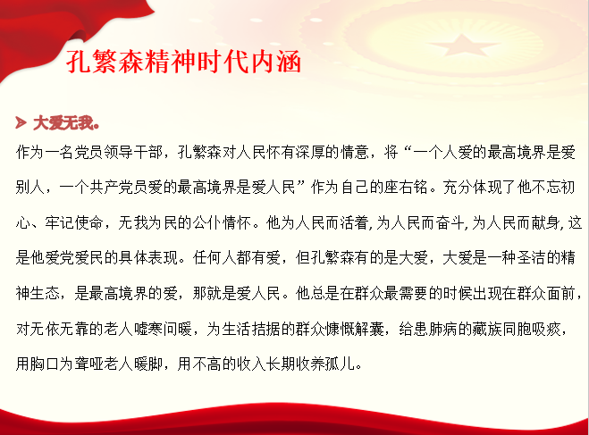 孔繁森精神体现在:忠诚担当,心系群众,为民着想,大爱无我,拼搏奋斗,廉洁奉献。习总书记在《执政意识和执政素质至关重要》一文中,提出要求:“像领导干部的好榜样焦裕禄、孔繁森、郑培民等英模人物那样,做一个亲民爱民的公仆,做一个忠诚正直的党员,做一个靠得住、有本事、过得硬、不变质的领导干部。”