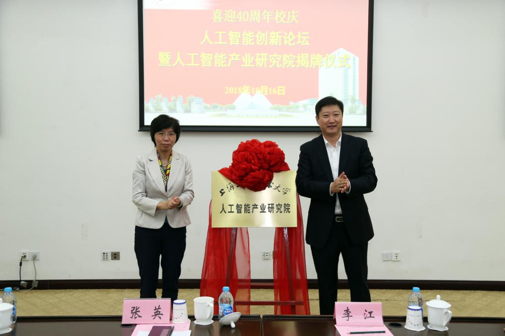 当日下午1点,人工智能创新论坛暨人工智能产业研究院揭牌仪式,在上海工程技术大学松江校区图文信息中心隆重开幕。上海工程技术大学、上海松江区政协、上海松江区科委、上海市经信委等领导共同见证了这一历史性时刻。上海工程技术大学科研处处长陈思浩等主持论坛与揭牌仪式。上海工程技术大学副校长姚秀平,松江政协副主席、科委主任赵宏卫,上海市经信委总工程师张英等为论坛致辞。上海工程技术大学党委书记李江与上海市经信委总工程师张英为“人工智能产业研究院”揭牌。