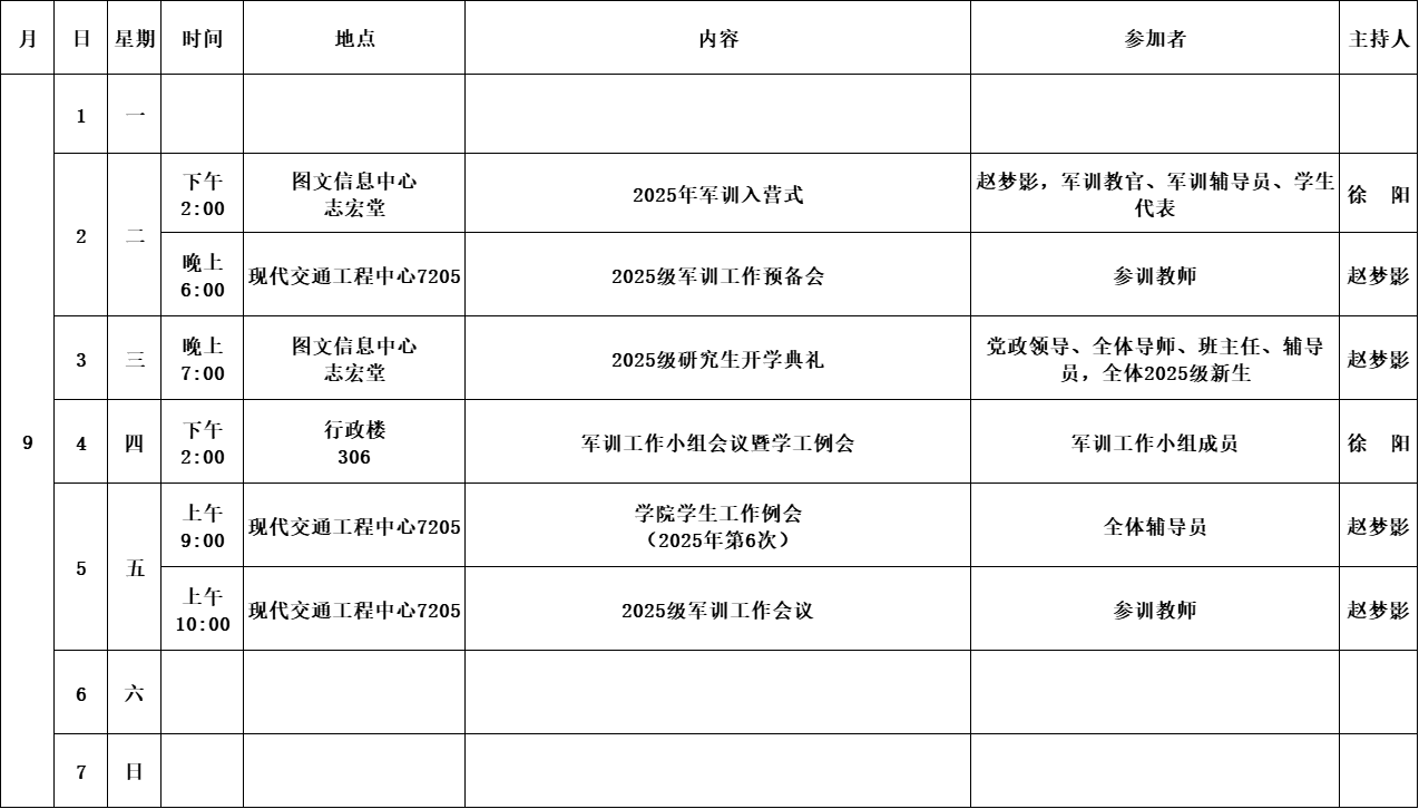 学院第0周活动安排(2025年9月1日至9月7日)