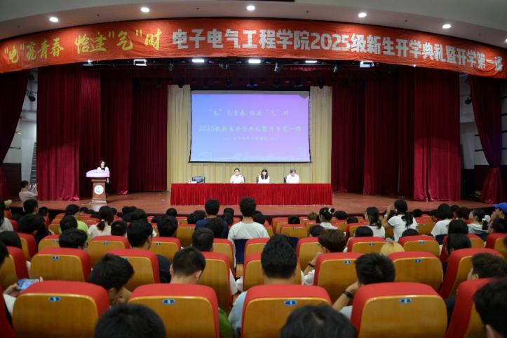 9月16日晚,电子电气工程学院2025级新生开学典礼暨开学第一课在志宏堂隆重举行。学院党委书记王成涛,党委副书记、院长李媛媛,副院长王晓军,以及教师代表,校友代表,导生代表,志愿者代表,2025级本科全体新生共同出席。典礼由党委副书记赵梦影主持。