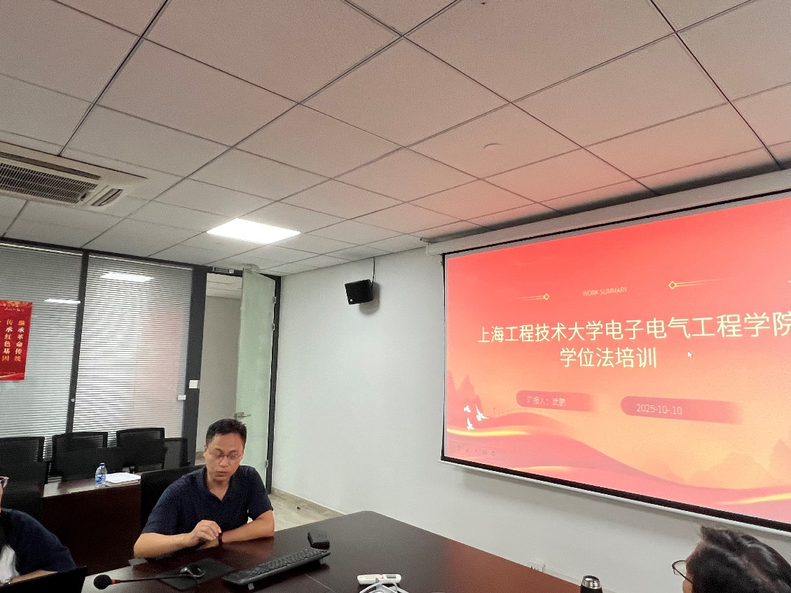 为深入贯彻落实国家最新教育法律法规,全面提升研究生培养质量, 10月10日下午,电子电气工程学院召开《中华人民共和国学位法》导师培训会。本次学习会由学院党委委员武鹏老师担任主讲,面向全院研究生导师进行了系统、深入的法规解读。