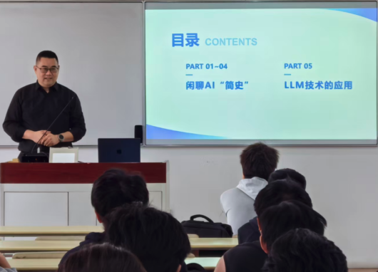 王博士的授课题目是“人工智能前沿技术及企业最新实践”。王博士分享了人工智能在广泛领域的应用,包括语音识别领域。授课中,王博士结合自身在工业界多年的技术研究以及人工智能在诺基亚业务中的最新实践,深入浅出地剖析当前人工智能领域的热点问题与发展趋势、以及人工智能在大语言模型中的应用与挑战,并进一步分享了人工智能技术在诺基亚的企业日常工作中的应用案例,如VIP投诉处理智能体、家宽装维智能体、数据自服务智能体、代码生成智能体等。王博士将复杂的人工智能技术转化为生动的行业故事,让学生们感受到人工智能真正可以赋能千行百业。