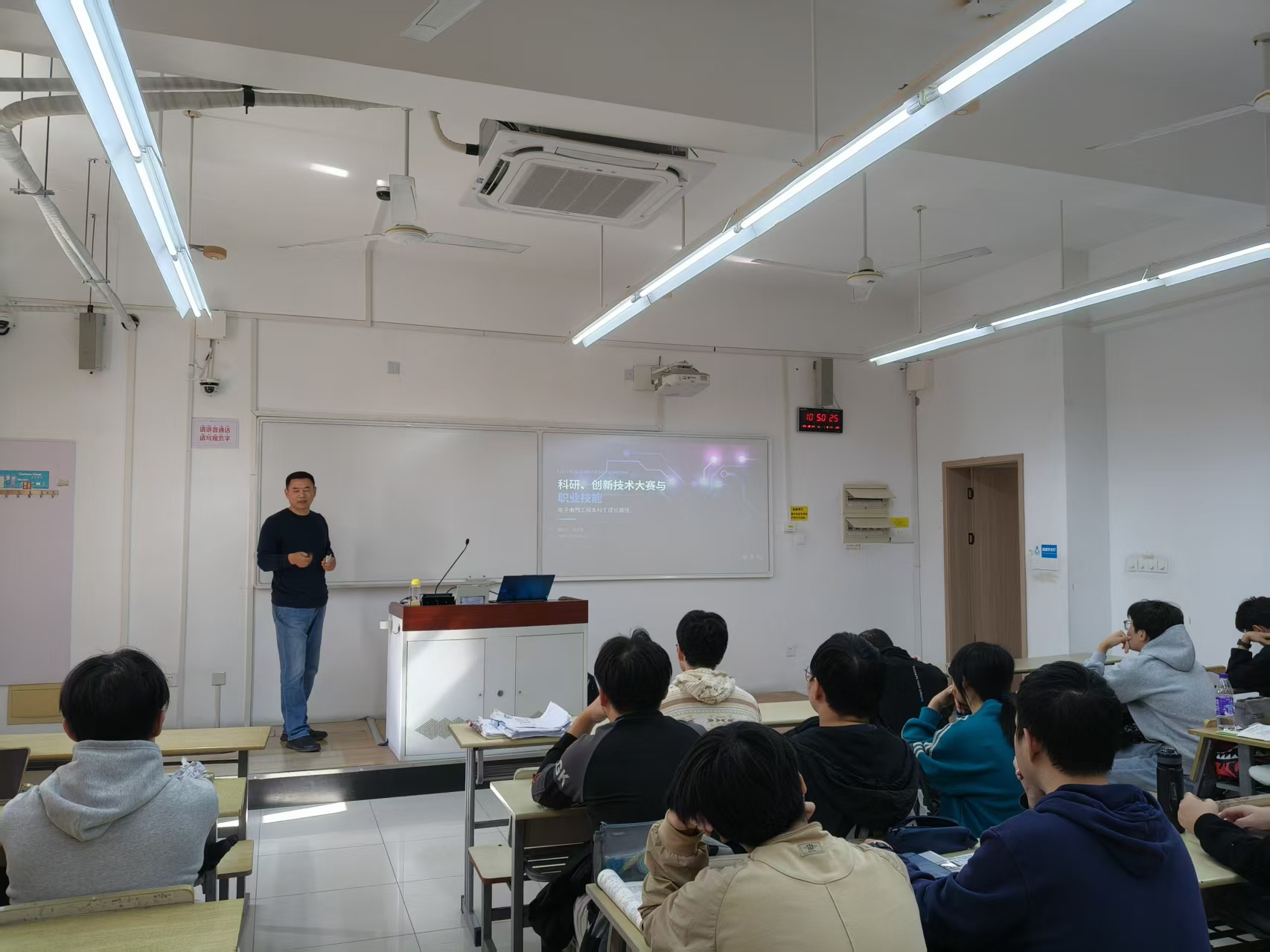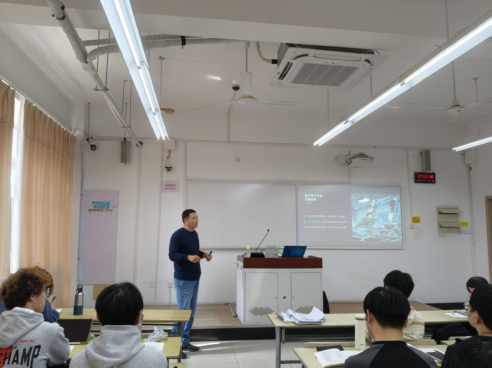 10 月 31 日上午,上海工程技术大学电子电气工程学院《单片微机应用技术》课堂迎来特殊一课。上海睿联鸿晟智能科技有限公司总裁郑光远受邀莅临课堂,以 “电子电气工程本科生成长路径” 为核心,围绕科研融入、创新赛事参与、职业技能精进等关键方向,结合自身二十余年行业深耕经验,为同学们带来一场兼具理论深度与实践温度的精彩分享,助力上海工程技术大学青年学子明晰成长方向、赋能专业发展。