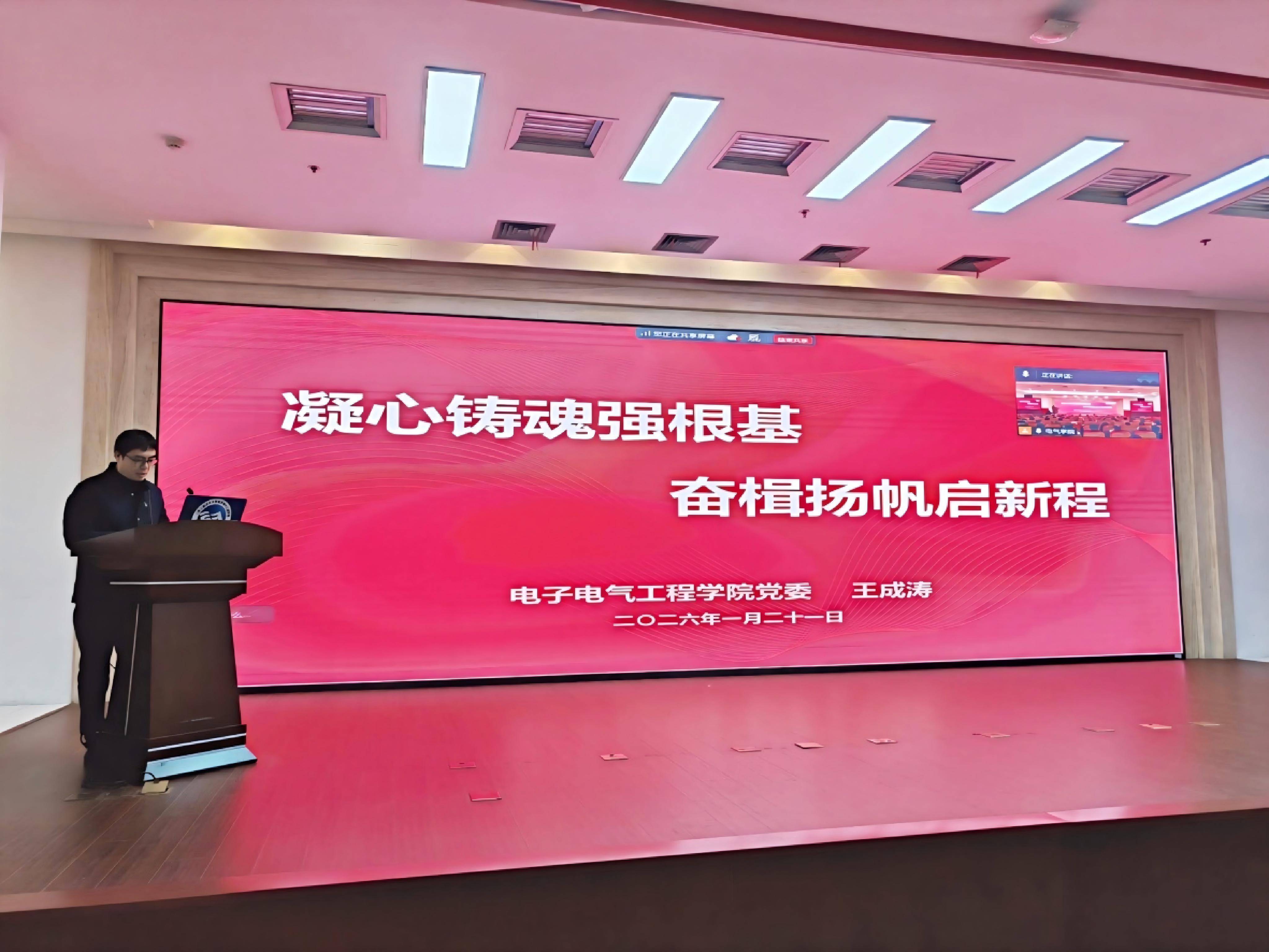 2026年1月21日上午,电子电气工程学院在图文信息中心第二报告厅召开2025年度工作报告会暨年终表彰大会,娄永琪校长莅临指导并发表重要讲话。学院党委书记王成涛主持会议,全体教职工参加会议。