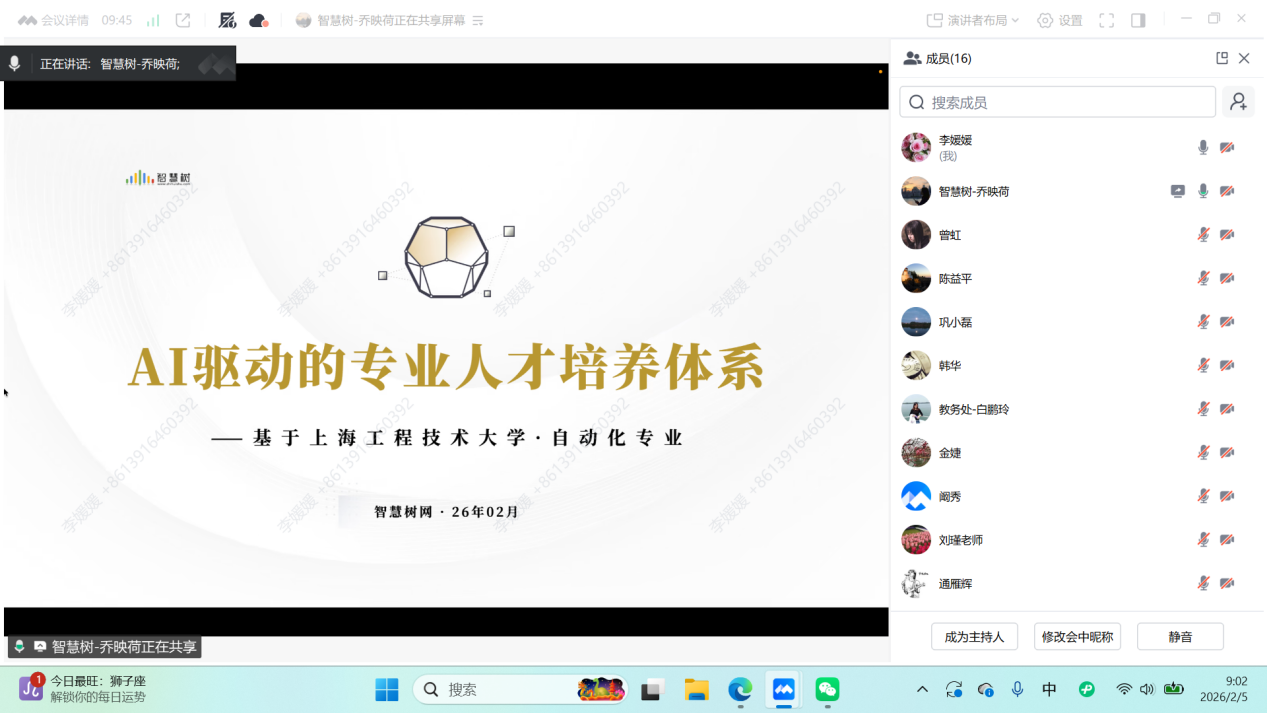 为深入推进人工智能与专业教育融合发展,创新人才培养模式,2月5日上午,电子电气工程学院与智慧树网就“AI驱动的专业人才培养体系建设”开展了线上专题研讨会,相关教师与智慧树团队围绕自动化专业建设与人工智能融合路径展开深入交流。会议由电子电气工程学院李媛媛教授主持,上海工程技术大学信息办主任刘瑾、副主任周伟,以及教务处白鹏玲等老师参加会议,学院电子信息系和自动化系韩华、阚秀等老师参加研讨,智慧树代表胡鹏、乔映荷等工程师作主题发言。