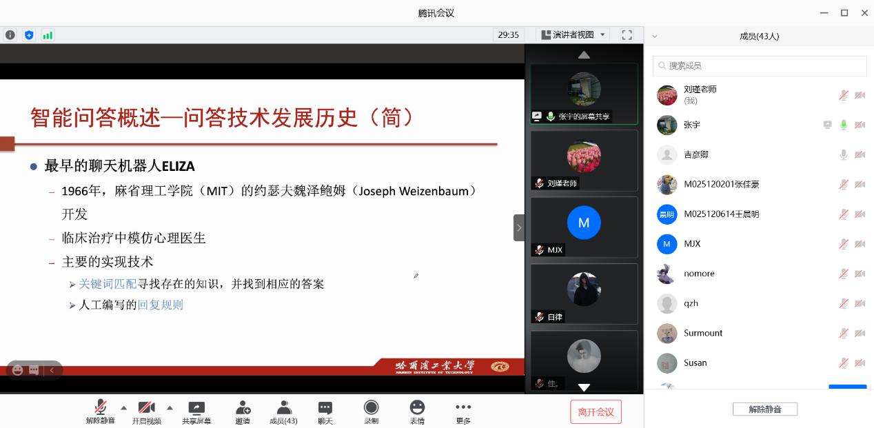 11月5日下午,学院与科研处共同邀请到哈尔滨工业大学张宇教授作题为“智能问答中的语义分析与推理技术”的线上学术报告,相关专业教师与研究生参加,会议由副院长刘瑾主持。
