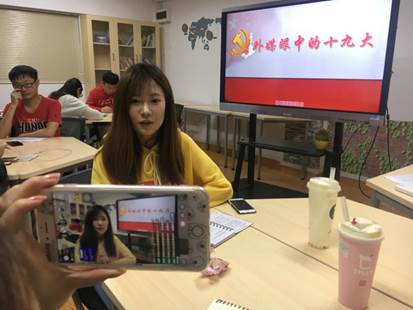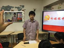 围绕“国内媒体眼中的十九大、外媒眼中的十九大、普通百姓眼中的十九大、党员同志眼中的十九大”四个方面,支部党员面对直播镜头,人生第一次做“十九大”的“直播员”。支部党员李润宁、王珊等几位党员挑选了国内多家媒体有关“十九大”的报道,其中讲到《人民日报》以发展为主题的评论文章《欢欣鼓舞迎接十九大》,总结了过去五年的成就,表达了对各自行业未来的展望,展现了各行业期望在十九大上得到国家对行业发展的指导的情景;支部党员着眼国外媒体对中国“十九大”召开发表的专题社论,描述国际友人对中国的快速发展和迅速崛起有何评价。直播中陈贝瓅和诸怡引用了印度斯坦时报(Hindustan Times)、西班牙埃菲通讯社(EFE)对十九大的报道,并指出外媒已经逐步改变对中国的偏见,中国已经快速地从一个在他们眼光中经济实力不强的发展中国家成长为一个经济强国。同时,中国也寻求在国际上发挥更大的作用,也将承担更多的国际责任;支部党员李志伟、王晨旭等几位党员,从普通老百姓最关心的事情入手,为大家讲述了百姓息息相关的生态环境、脱贫攻坚、生活服务、反腐倡廉等问题。他们讲到,习总书记在十九大报告中强调“坚持在发展中保障和改善民生”,同时也指出“增进民生福祉是发展的根本目的”。我党从多方面考虑,谋民生之利,解民生之忧,使广大人民群众在共建共享发展中产生更大的获得感;支部党员周雨宸、傅盈等几位党员,站在学生党员的角度,从学习贯彻十九大精神,大力发扬理论联系实际的学风方面开展介绍。周雨宸提到,学以致用是学习和贯彻十九大精神的根本保证,在自己学习和生活中要联系实际,,指导和推动自身能力的提高,不断端正自身的思想、学习和工作作风。