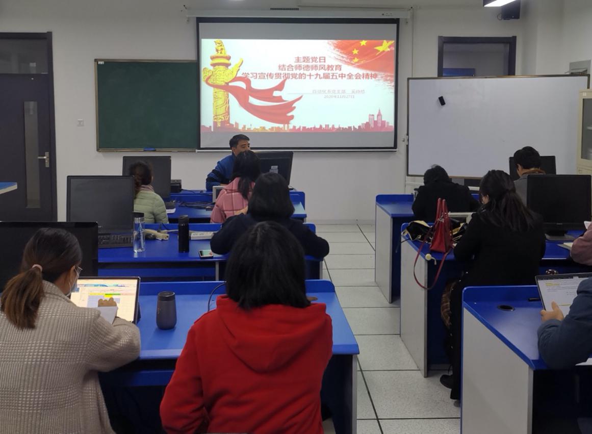 2020年11月27日,自动化系党支部召开了以“结合师德师风教育,学习宣传贯彻党的十九届五中全会精神”为主题的主题党日活动。会议上,自动化系党支部书记奚峥皓老师传达了党的十九届五中全会精神,重点解读了“十四五”规划主要发展目标、2035年远景目标和新发展体系、新发展理念、新发展格局等方面内容,并组织支部党员对十四五规划《建议》指出的建设高质量教育体系问题进行了探讨。