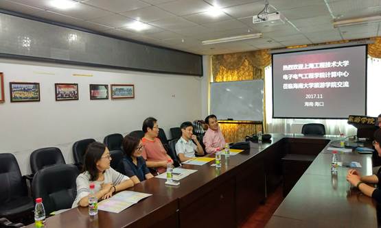 此后,陈强老师带队计算中心教师前往海南大学,受到了海南大学旅游学院信息管理系主任董林峰教授、信息管理系学科带头人曹扬博士、旅游管理系王凤霞教授、实验室主任王康寿副教授热情接待。大家围绕如何在新工科背景下展开非电专业计算机教学、加强校际科研合作以及大数据处理与分析、互联网+等热点进行了热烈的交流与讨论。随后,我们又参观了重点实验室和研究室等。