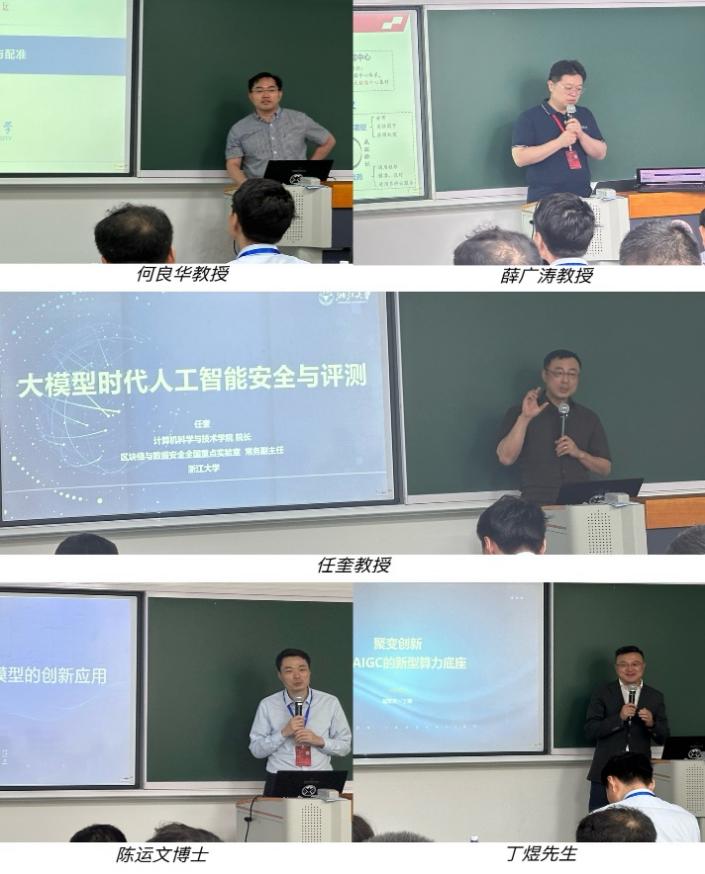 同济大学何良华教授带来了题为“高精度医学图像配准与分割”的精彩报告。介绍了其团队在医学图像分析领域的前沿研究成果,展示了人工智能在医学领域的巨大潜力。上海交通大学薛广涛教授以“云基础架构中的AI for System研究与探索”为题,深入剖析了大规模数据中心在新时代背景下面临的技术挑战和解决方案。超聚变数字技术有限公司算力业务CTO丁煜先生做了“聚变创新,面向AIGC的新型算力底座”的报告,分享了超聚变公司在AI大模型算力需求方面的核心发现和产业实践。达观数据有限公司董事长兼CEO陈运文博士带来了“行业知识库与垂直大模型的创新应用”报告,详细讲解了如何通过构建行业知识库和定制垂直大模型来增强企业的竞争力和创新能力,展示了人工智能在各行业中的广泛应用。浙江大学任奎教授以“人工智能安全与评测”为主题,介绍了浙大网安在人工智能安全评测和多模态深度合成检测方面的创新工作,为推动人工智能系统的安全可信发展提供了重要参考。
