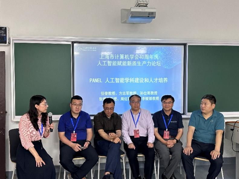 在“人工智能学科建设和人才培养”的PANEL环节。浙江大学计算机学院院长任奎教授、上海市5G+人工智能重点现代产业学院院长方志军教授、上海工程技术大学电子电气工程学院李媛媛教授、上海第二工业大学计算机与信息工程学院张博锋教授、上海交通大学孙仕亮教授、上海工业自动化仪表研究院有限公司周红福博士分别从高校和企业角度,展开了热烈讨论,分享了宝贵的见解与经验,为与会者提供了宝贵的参考和启示。