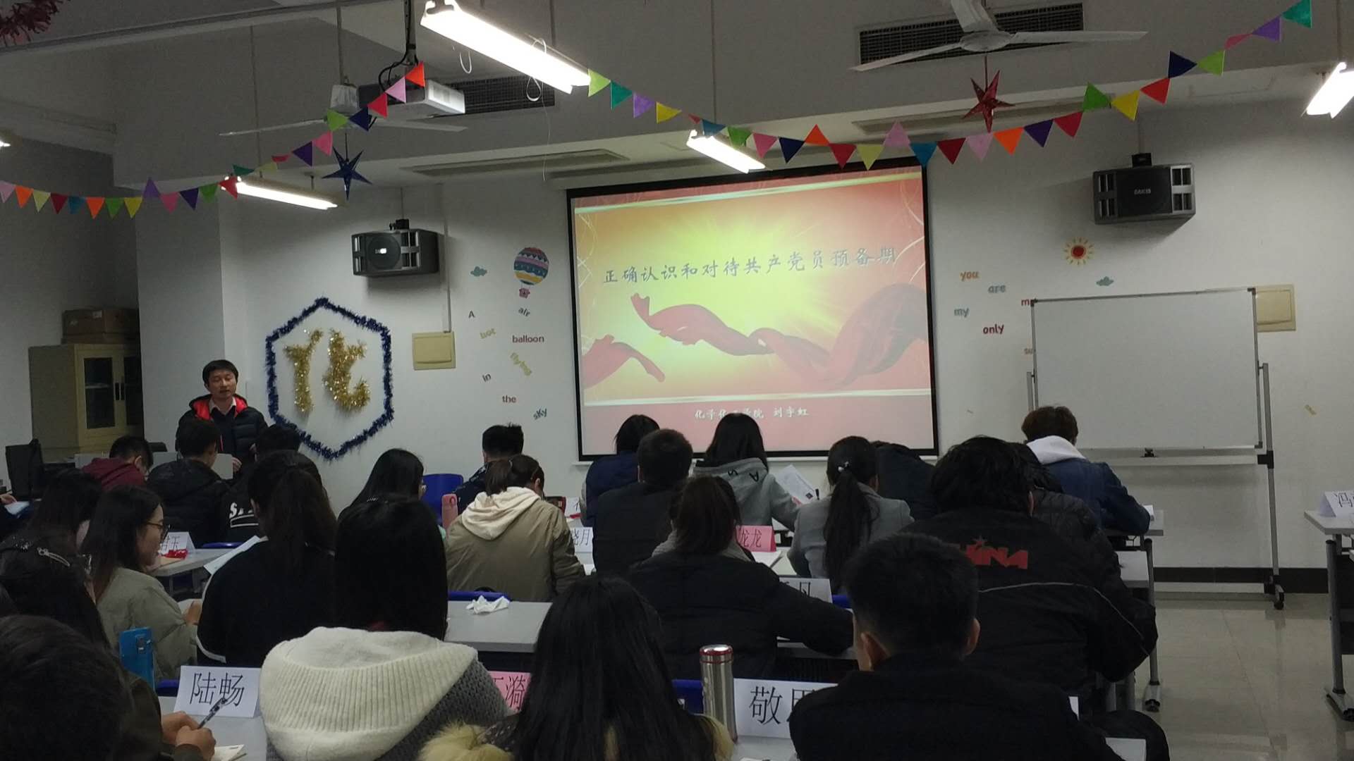 11月21日晚,上海工程技术大学第十三期预备党员培训班第一课在实训楼4405展开,化学化工学院的殷昊老师以“正确认识和对待共产党员预备期”为主题展开课程。本次课程在大家热烈掌声中拉开了序幕,迎来了本期预备党员培训班第一讲。