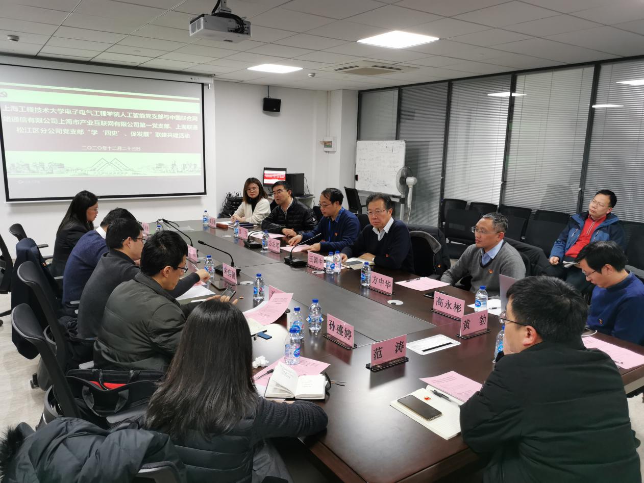 为深入贯彻落实习近平新时代中国特色社会主义思想,落实基层党组织开展“四史”教育,2020年12月23日,学院人工智能党支部与中国联通上海市产业互联网有限公司第一党支部、上海联通松江区分公司党支部“学‘四史’、促发展”联建共建活动。