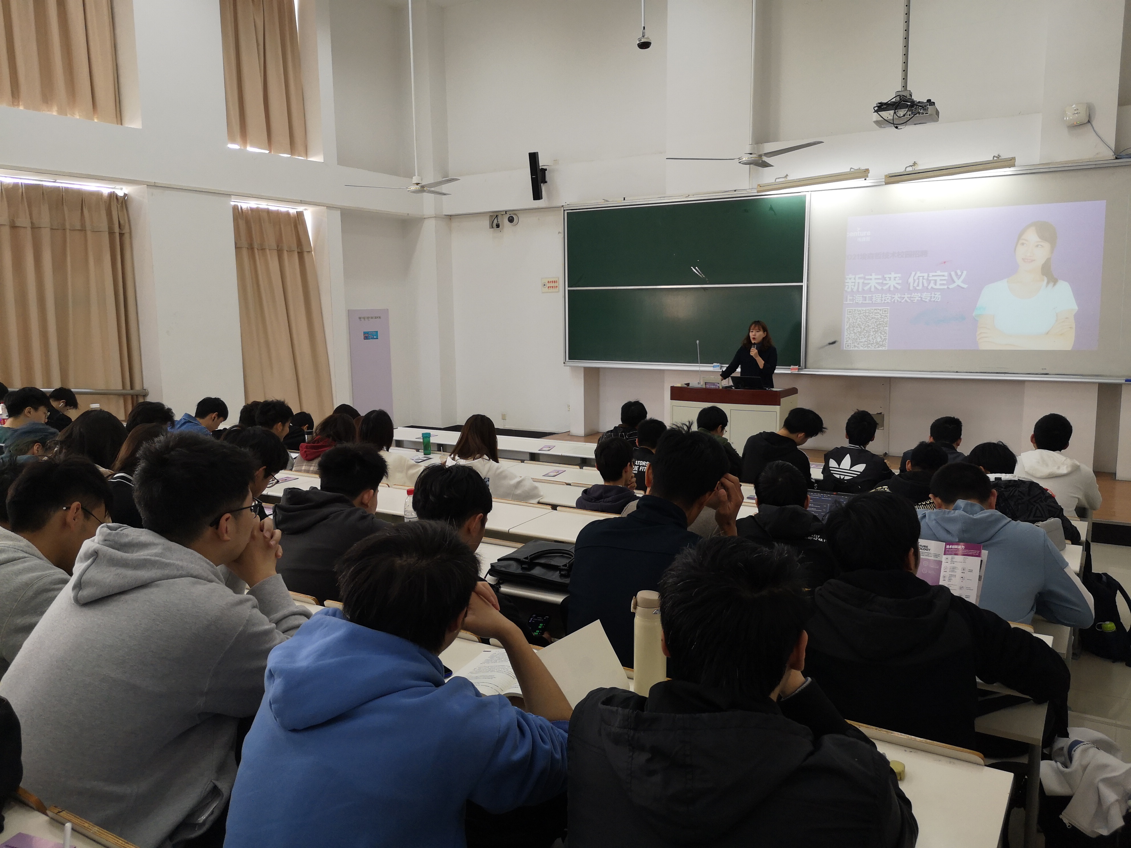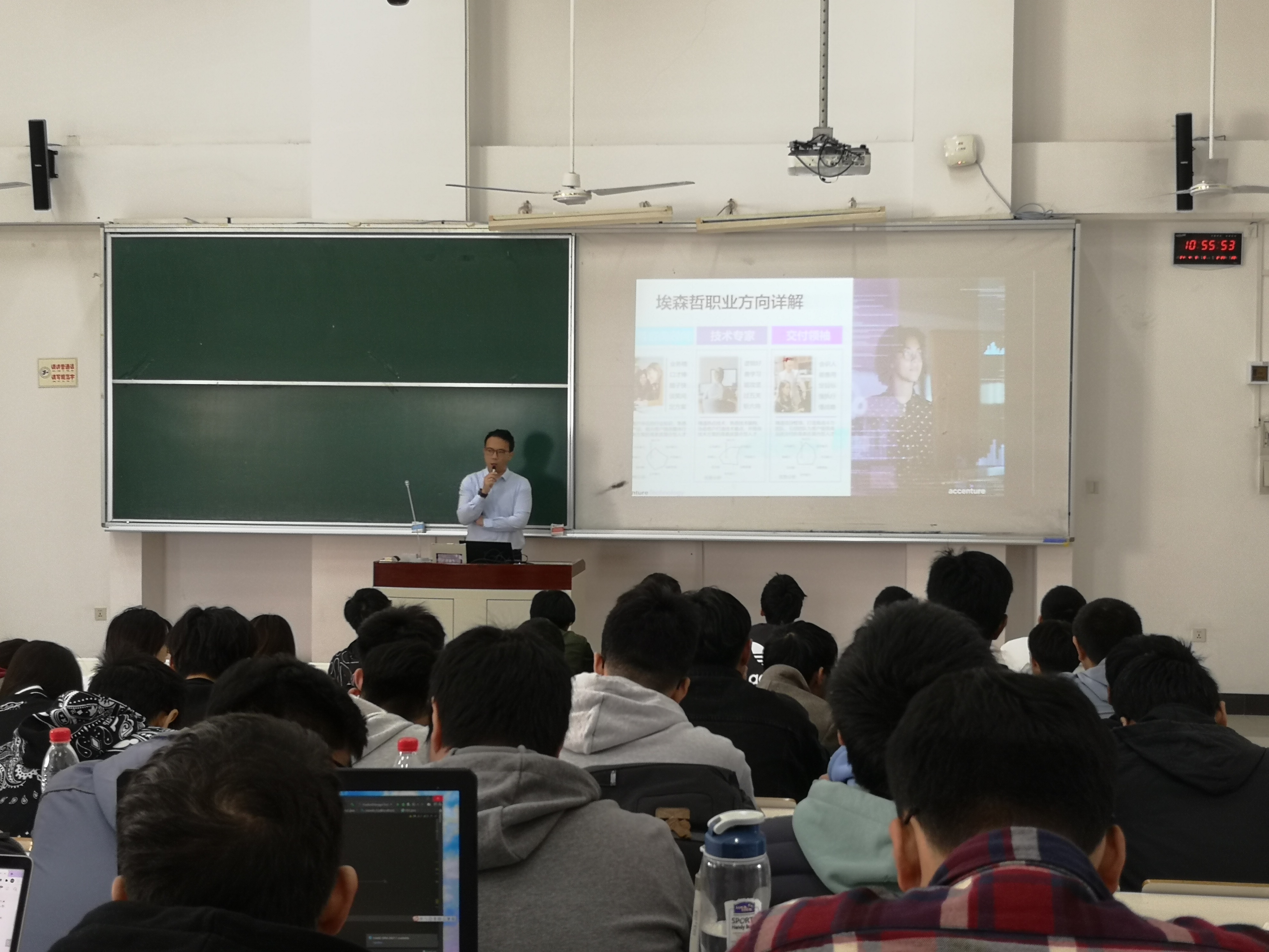 宣讲会现场,企业方向现场同学们介绍了埃森哲,并且详细将本次埃森哲招聘用人需求、企业的服务领域及项目研发方向、以及企业能为大家提供哪些福利待遇一一作了详细讲解。现场对同学们提出的相关问题进行了耐心的解答。