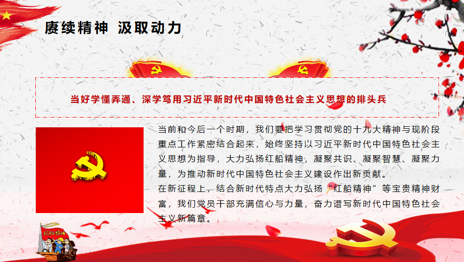 一条小船,诞生一个大党,“红船精神”同井冈山精神、长征精神、延安精神、西柏坡精神等一起,伴随中国革命的光辉历程,共同构成党在前进道路上战胜各种困难和风险、不断夺取新胜利的强大精神力量和宝贵精神财富,蕴含着极其丰富和博大精深的内涵。2005年6月21日,习总书记在《光明日报》上刊发5000多字的署名文章《弘扬“红船精神” 走在时代前列》中总结到,“红船精神”是开天辟地、敢为人先的首创精神,坚定理想、百折不挠的奋斗精神,立党为公、忠诚为民的奉献精神。
