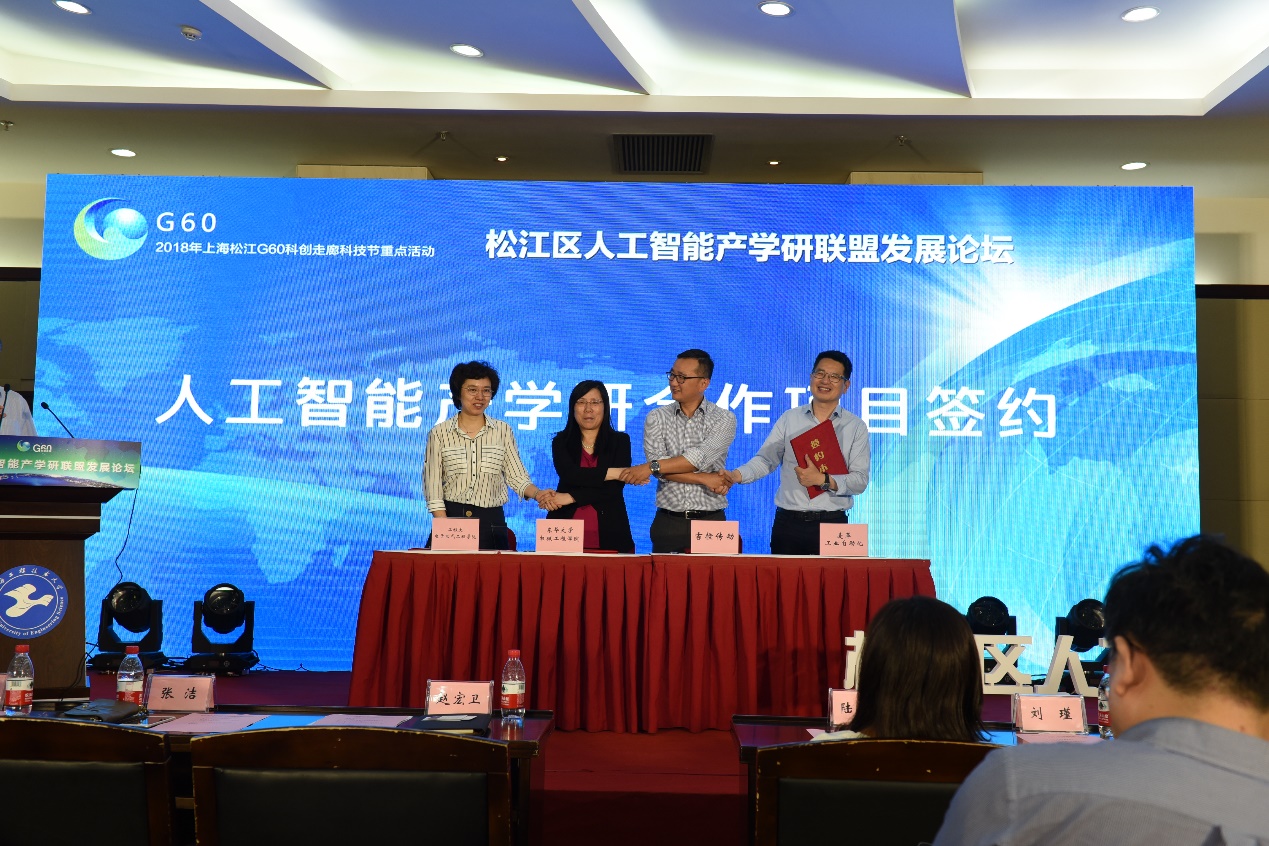 论坛上,电子电气工程学院党委书记陆展华与张洁院长共同为松江区人工智能产学研联盟揭牌。上海吉控传动系统有限公司、麦革工业自动化系统(上海)有限公司、上海工程技术大学电子电气工程学院、东华大学机械工程学院的代表进行了校企合作项目“零部件机加工生产线的智能改造项目”的签约。