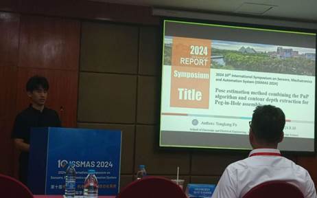 我院研究生付永康2024 年10月8日在上海2024 10th International Symposium on Sensors,Mechatronics and Automation System(ISSMAS 2024)会议上做报告。此次报告以“Pose estimation method combining the PnP algorithm and contour depthextraction for Peg-in-Hole assembly” 为主题,介绍了轴孔装配领域中精确的位姿估计对于提高装配效率和质量具有至关重要的意义。提出将 PnP 算法与轮廓深度提取技术相结合的创新性方法,并通过深入的理论分析与实验验证,展示了该方法在轴孔装配位姿估计方面的优势,为相关领域的技术发展提供了可行的思路与有力的技术支撑。