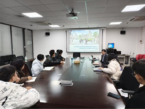 石碰教授以深入浅出的方式为在场师生深度解读了多智能协同控制在开放和复杂环境中的应用。报告首先介绍了多智能体系统的基本概念,探讨了其在当前控制领域的研究热点以及分支研究领域。石教授生动地描绘了多智能体系统在当下智能控制中的应用前景,为在座听众呈现了一个人工智能与现实产业融合的生动画面。