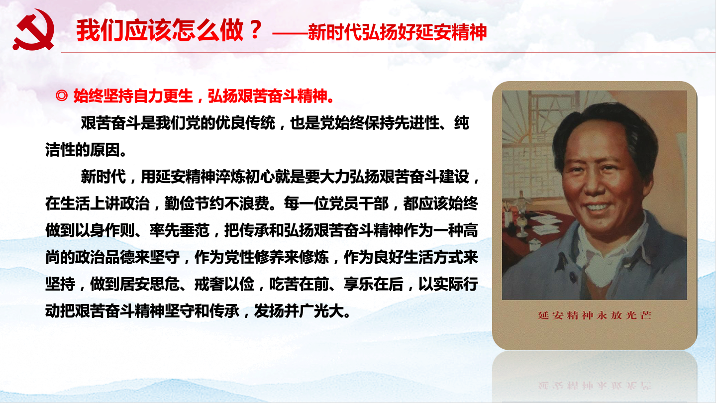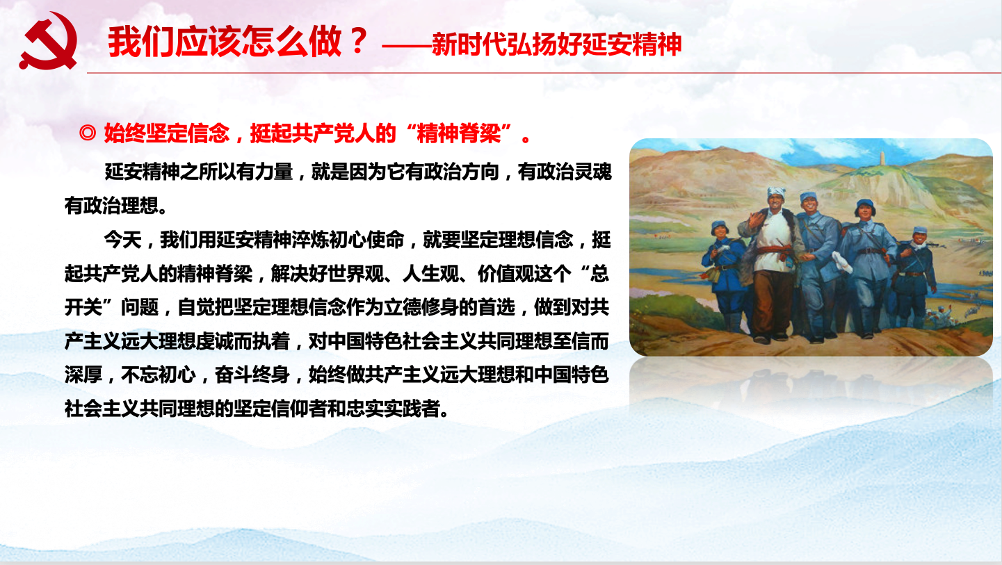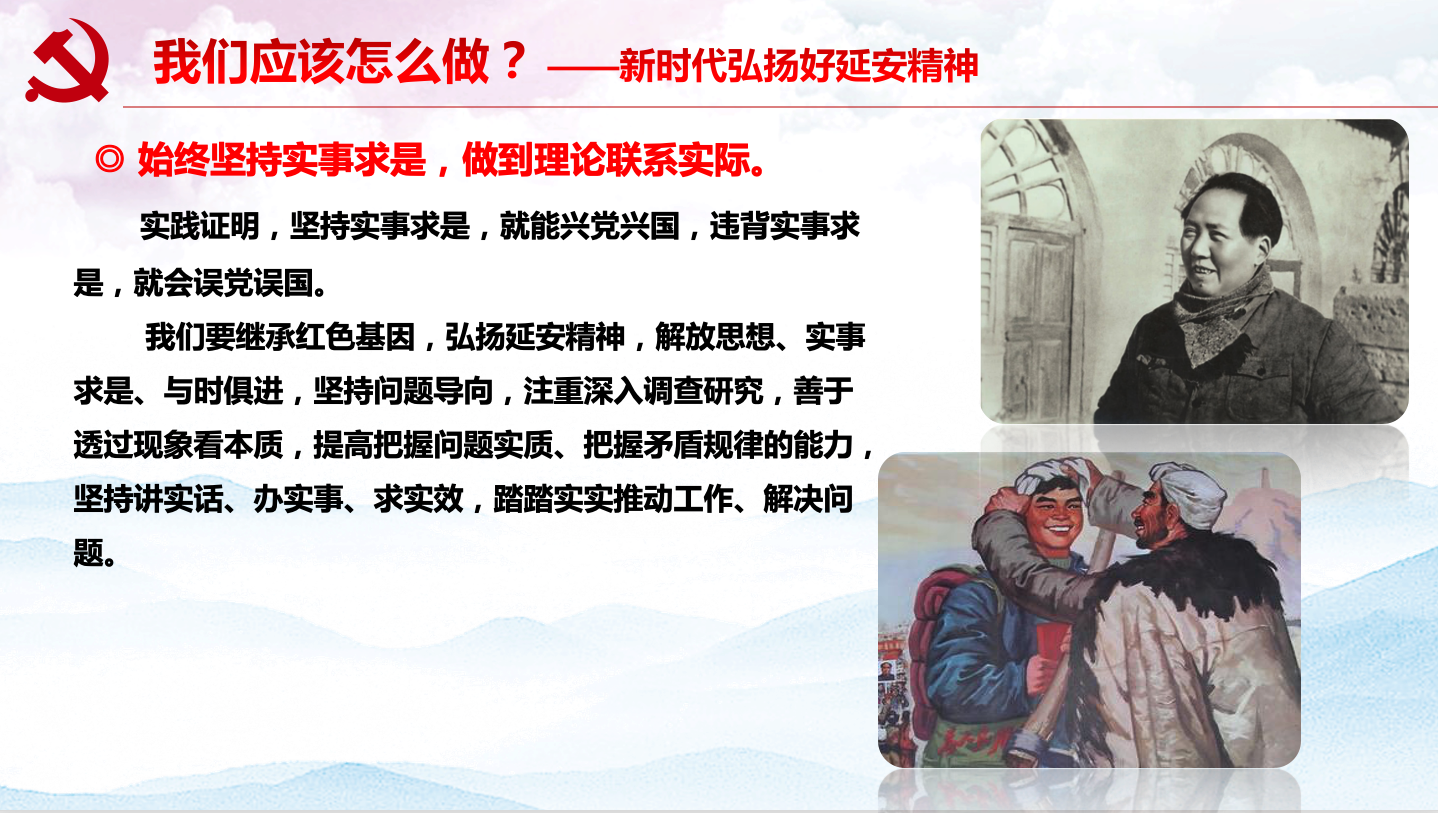 朱海老师分享到,“延安精神”体现在:坚守正确的政治方向,坚持实事求是,坚持全心全意为人民服务,坚持自力更生、艰苦奋斗的精神。习近平总书记在延安调研时指出,延安精神培育了一代代中国共产党人,是我们党的宝贵精神财富。要坚持不懈地用延安精神教育广大党员、干部,用以滋养初心、淬炼灵魂,从中汲取信仰的力量、查找党性的差距、校准前进的方向。