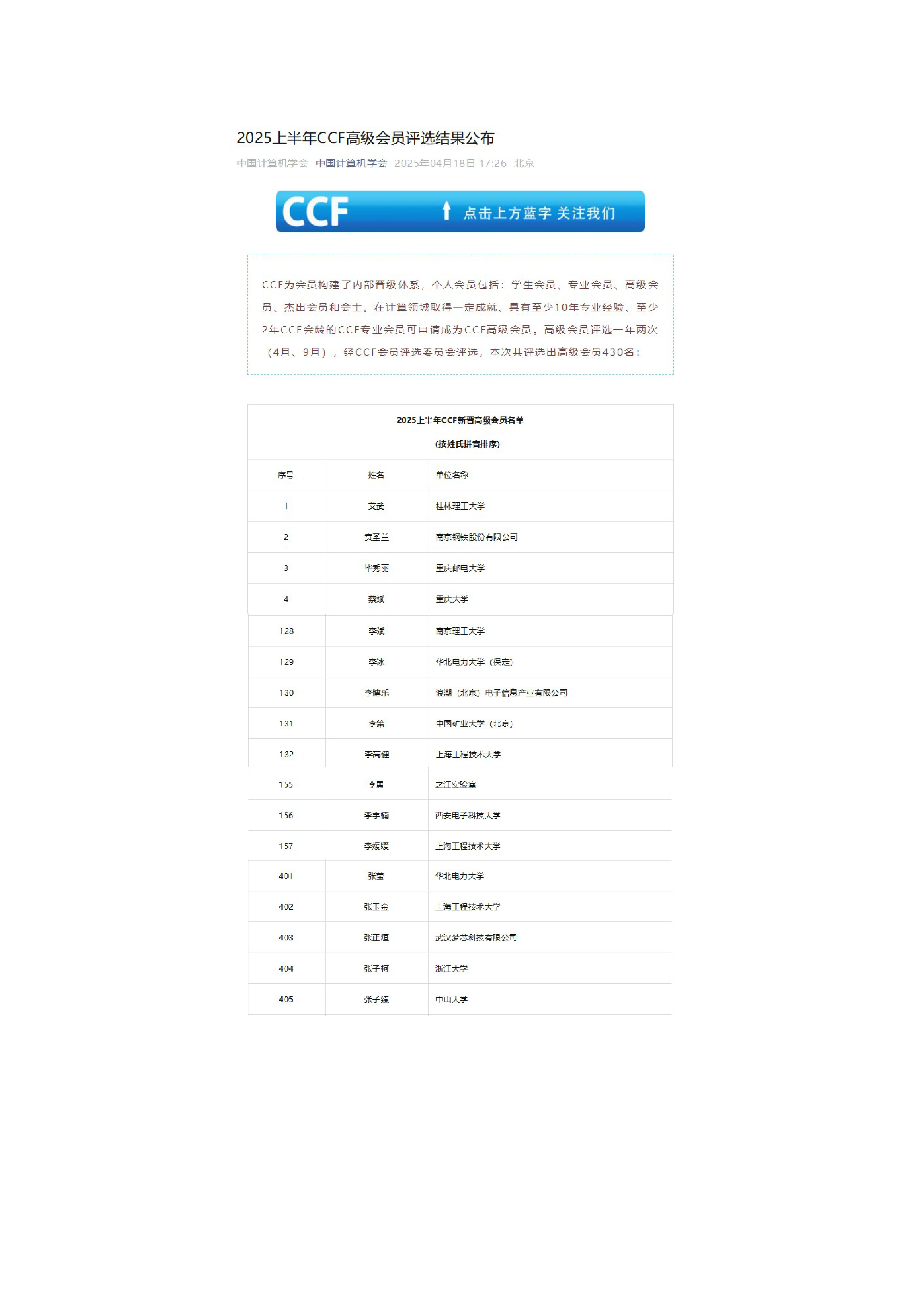 中国计算机学会(CCF)成立于1962年,是中国计算机及相关领域的学术团体,宗旨是为本领域专业人士的学术和职业发展提供服务;推动学术进步和技术成果的应用;进行学术评价,引领学术方向;促进技术和产业应用一线的交流和互动;对在学术和技术方面有突出成就的个人、企业和单位给予认可和表彰。CCF高级会员荣誉授予那些在计算机领域取得一定成就、具有至少10年专业经验、至少2年CCF连续会龄的CCF专业会员。每年仅有不超过百分之一的专业会员当选CCF高级会员。CCF会员评选委员会按照评审规则,从学术贡献、对CCF的贡献、业界认可、CCF会龄等维度认真对每位候选人申请材料和推荐人意见进行综合考量。取得CCF高级会员身份表明专业水平已经达到一定的高度,是一项较高的学术荣誉。