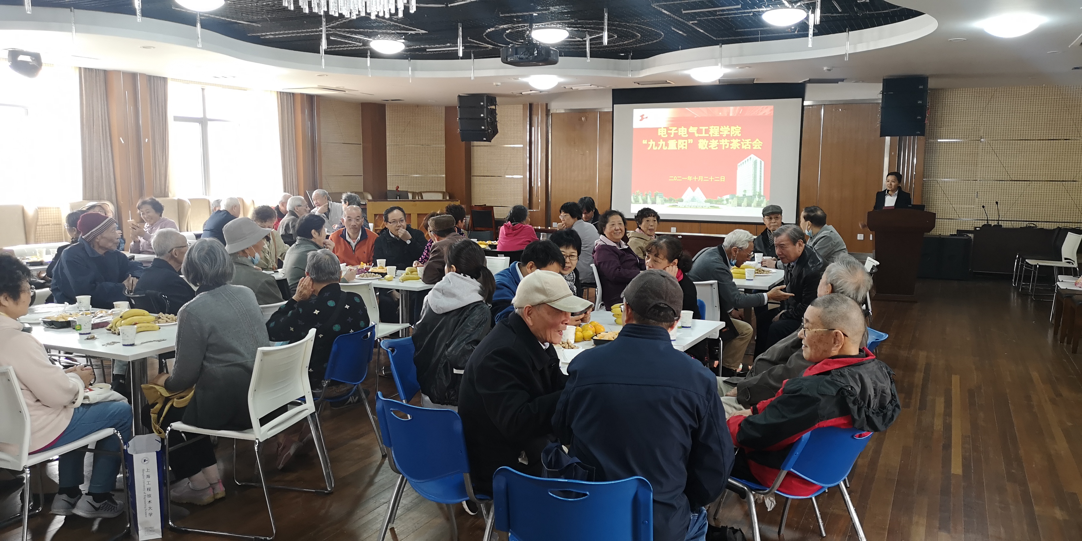 2021年10月22日下午,在第34个敬老节暨九九重阳节到来之际,学院工会在学院党政领导的支持下,在长宁校区综合楼5楼多功能厅举行了“颂党恩,庆重阳”敬老节活动,学院有60多位退休教师参加了此次活动。学院党委书记范君晖、副院长王晓军、院工会主席施一萍以及部分系室主任、支部书记、院工会小组长们也参加了茶话会。会议由范君晖同志主持。