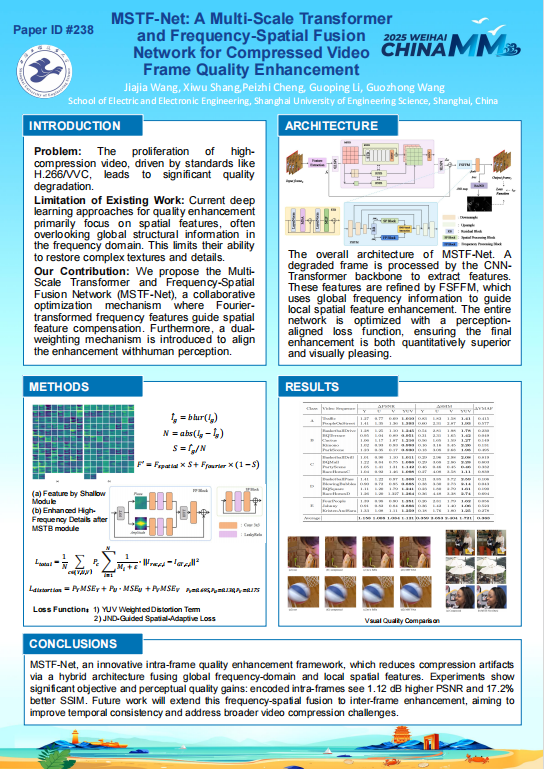 此次参会是电子电气工程学院推动学术交流、促进学科发展的常规举措。学院选送的交流论文《MSTF-Net: A Multi-Scale Transformer and Frequency-Spatial Fusion Network for Compressed Video Frame Quality Enhancement》聚焦视频增强处理研究领域,针对高压缩视频因H.266/VVC等编码标准应用导致的画质退化问题,以及现有深度学习方法偏重空间特征、忽视频域全局结构信息而难以恢复复杂纹理细节的局限展开研究。研究团队提出多尺度 Transformer与频域-空域融合网络(MSTF-Net),通过CNN-Transformer骨干网络提取退化帧特征,再经频域-空域融合模块(FSFFM)利用全局频域信息引导局部空域特征增强,结合感知对齐损失函数优化网络,形成协同优化机制。