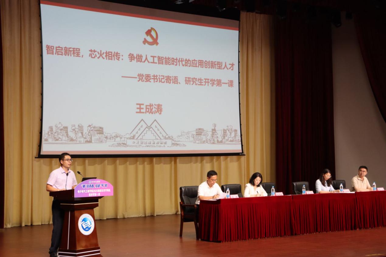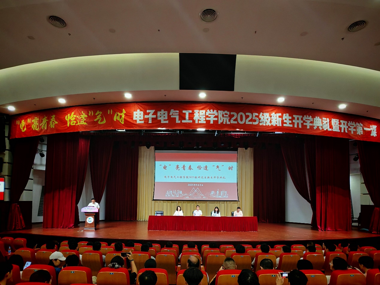 9月3日晚,电子电气工程学院2025级研究生开学典礼暨开学第一课在志宏堂隆重举行。学院党委书记王成涛、院长李媛媛、党委副书记赵梦影等班子成员及党委委员,学院硕导代表,研究生党支部书记、辅导员、秘书和班主任等出席了开学典礼。本次典礼由学院党委委员武鹏主持。