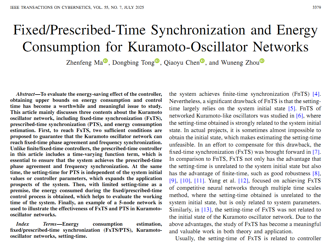 近期,电子电气工程学院童东兵教授指导硕士研究生马振峰在顶级期刊《IEEE Transactions on Cybernetics》,发表题为“Fixed/prescribed-time synchronization and energy consumption for Kuramoto-oscillator networks”的最新研究成果。该期刊是美国电气与电子工程师学会会刊,系国际自动化与控制系统领域中科院SCI一区顶级期刊,2025年影响因子为10.5。
