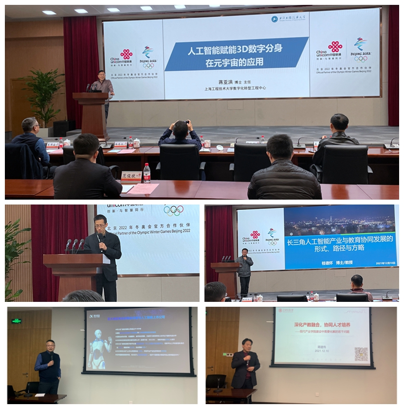 在本次论坛的专家报告环节,上海工程技术大学数字化转型工程中心主任蒋亚洪博士分享了《人工智能赋能3D数字分身在元宇宙的应用》、上海联通智能制造事业部技术总监沈洲博士分享了《5G赋能,智联未来,基于场景的产业数字化转型探索及需求分析》、诺基亚贝尔公司桂德怀教授分享了《长三角人工智能产业与教育协同发展的形式、路径与方略》、科大讯飞咨询总监李伟国分享了《新一代数字经济背景下的产业学院建设思路》、上海交通大学蒋建伟教授分享了《深化产教融合,促进协同育人——现代产业学院建设中需要化解的若干问题》。