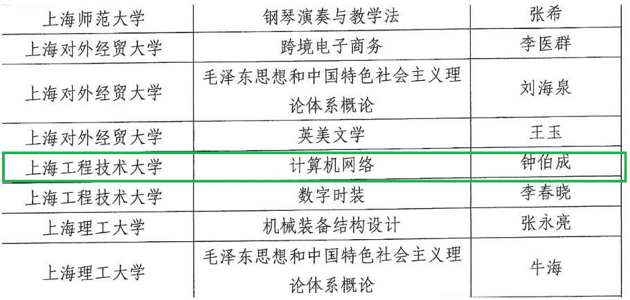 近日,上海市教育委员会发布《上海市教育委员会关于公布2021年度上海高等学校一流本科课程认定结果的通知》,上海工程技术大学共有9门课程被认定为2021年度上海高等学校一流本科课程,我院钟伯成教授及《计算机网络》课程教学团队入选一流本科课程线上线下混合课程类别。祝贺钟伯成教授及《计算机网络》课程教学团队!