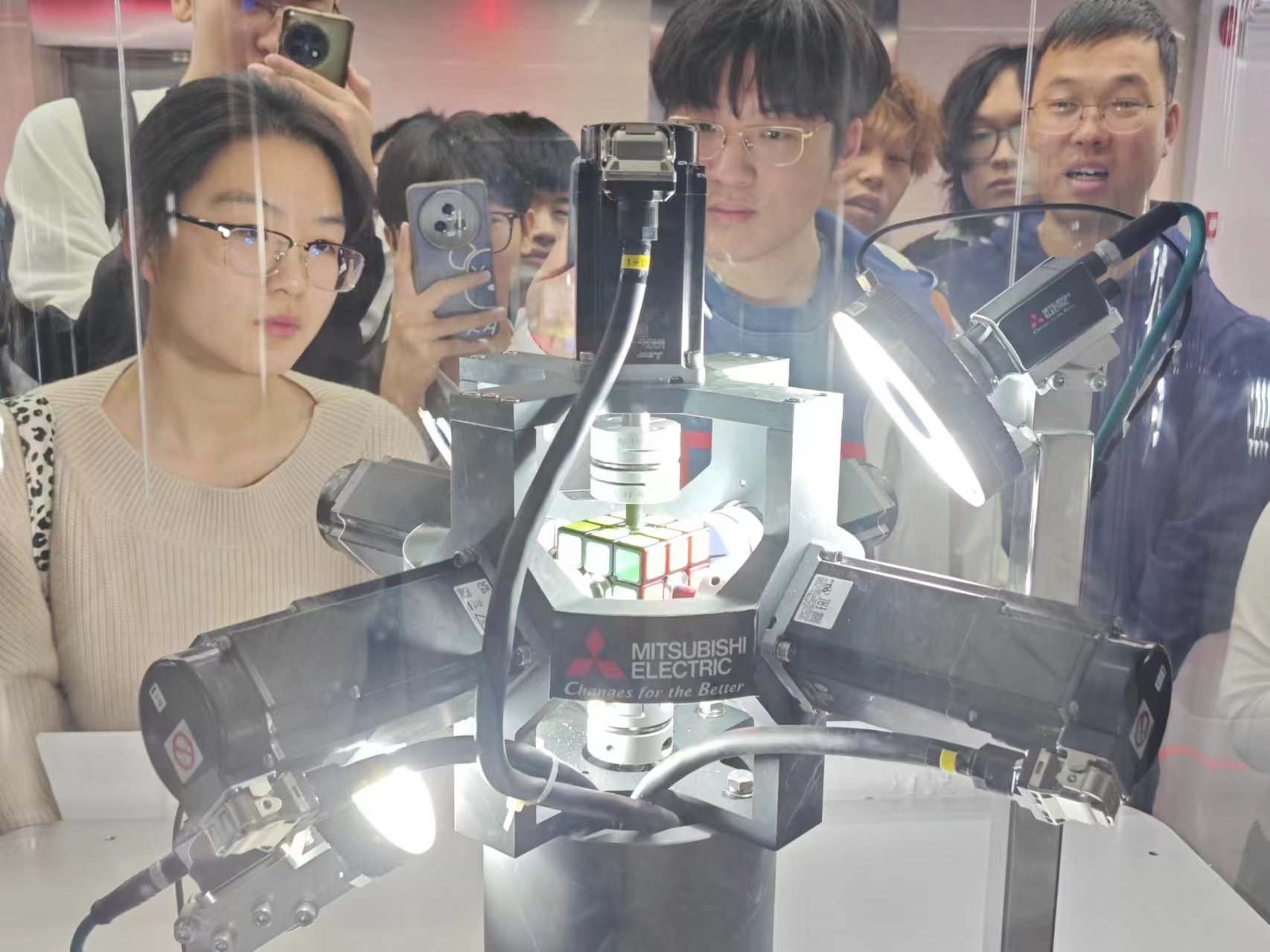 在三菱电机自动化中心工作人员的热情接待下,师生们先后参观了智能制造展示区、工业自动化解决方案体验中心及最新PLC、伺服系统、人机界面等核心产品的应用场景演示。通过现场讲解与互动体验,同学们直观了解了工业自动化前沿技术在实际生产中的集成应用,深刻感受到智能制造对产业升级和高质量发展的推动作用。