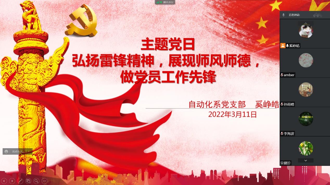 2022年3月11日,自动化系党支部通过腾讯会议平台召开了以“弘扬雷锋精神,展现师风师德,做党员工作先锋”为主题的党日活动。会议由自动化系党支部书记奚峥皓主持,自动化系支部党员出席了本次会议。