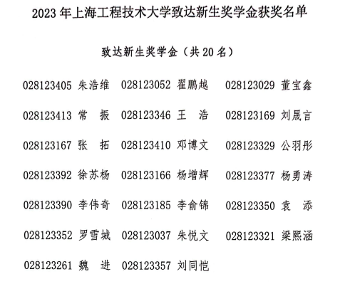 致达奖学金依据上海工程技术大学教育发展基金会与致达控股集团有限公司(以下简称“致达集团”)共同协商签订的协议设立。致达集团为我院杰出校友创立企业,集团多年来持续为我院新生与国际交流学生颁发奖学金,帮助我院吸引优秀生源,在企业反哺学校学院发展方面起到示范作用。致达集团于2003年3月28日在浦东新区市场监管局登记成立,经营范围包括项目投资,投资信息咨询、企业管理咨询、物业管理等。2019中国制造业企业500强榜单发布,致达控股集团有限公司名列第384位,集团官网:www.zetagroup.cn。本年度,依据学生入学高考成绩,共计二十名学院新生获得该企业奖金,获奖名单如下。