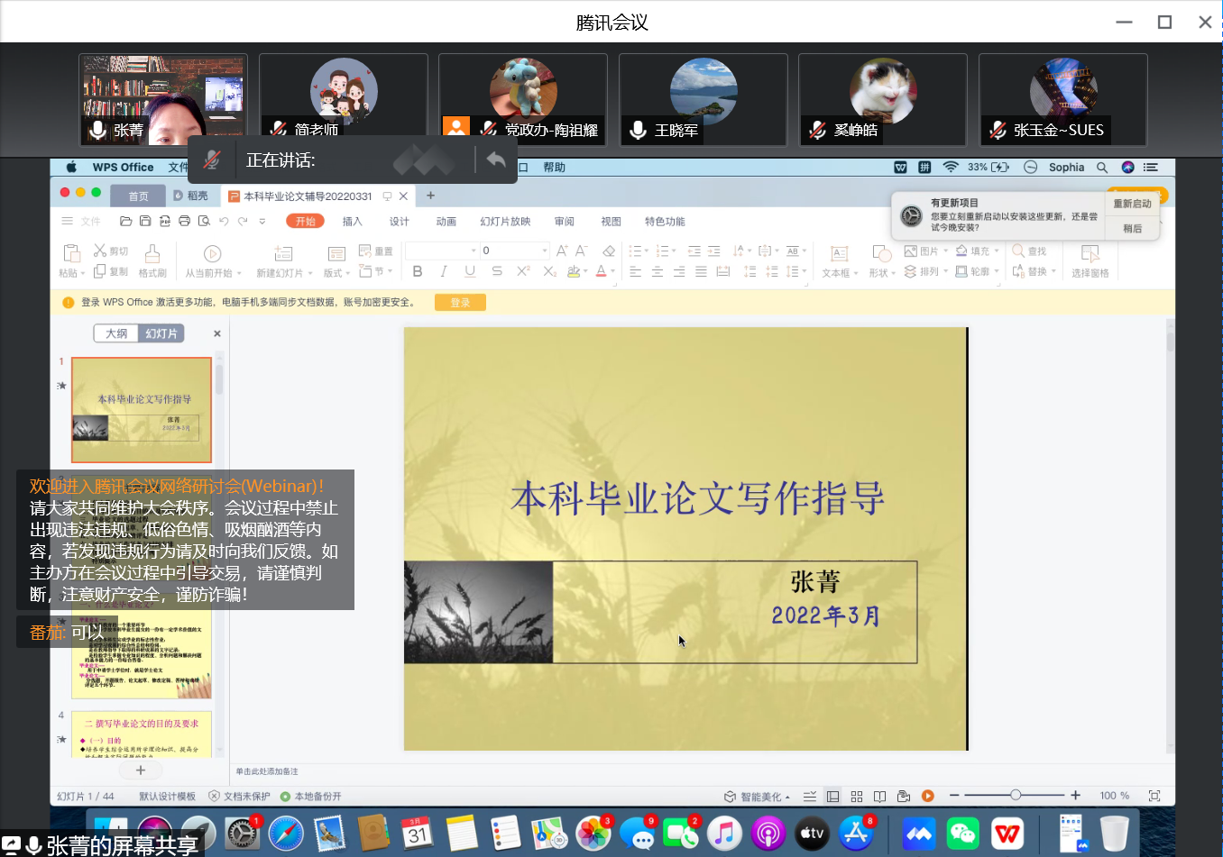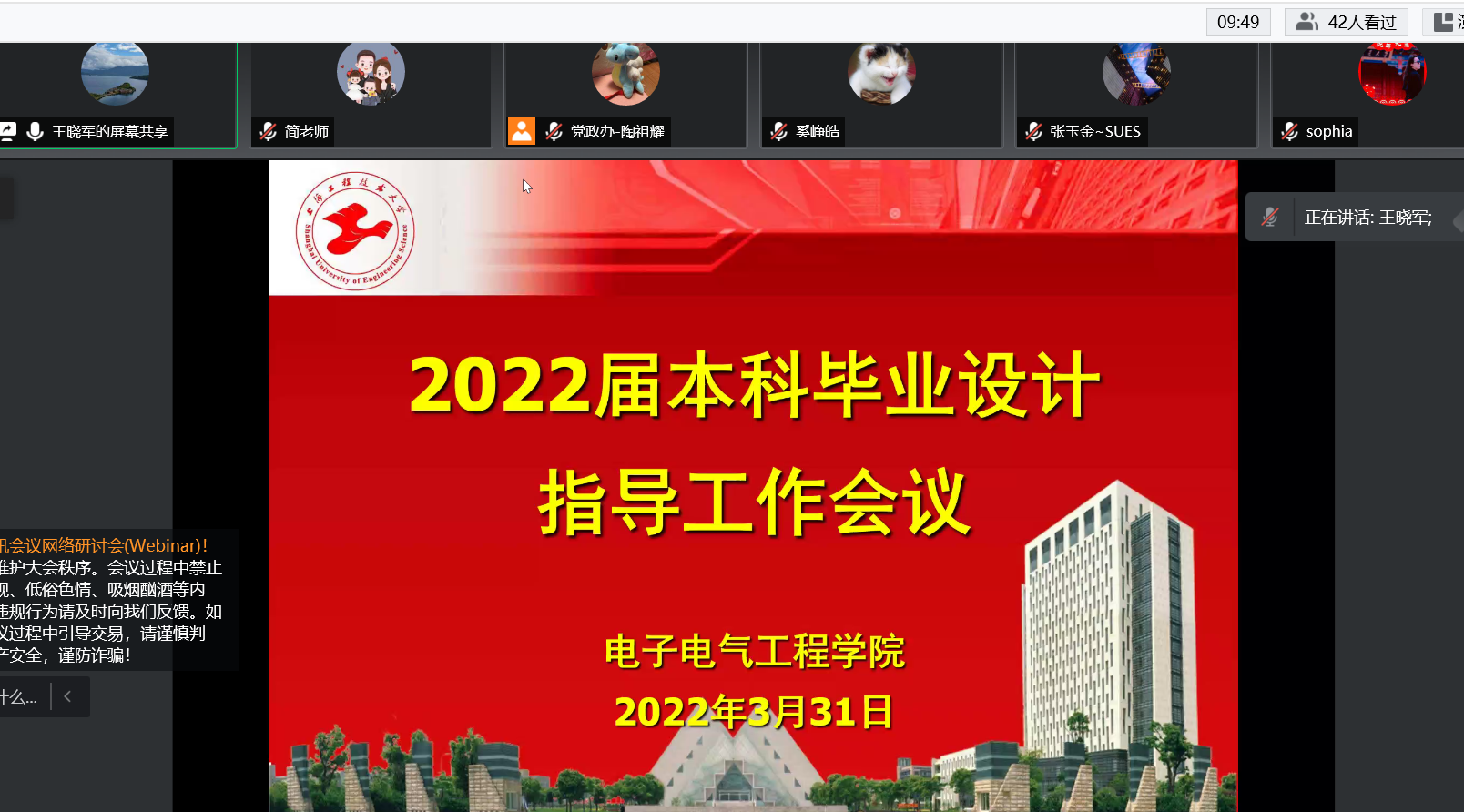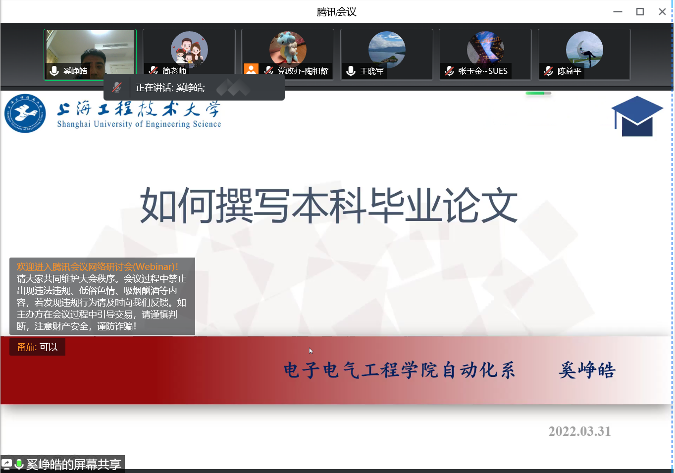 为确保本科毕业论文质量,明确毕业论文撰写要求,学院于3月31日上午九点通过线上会议,召开了全体本科毕业生毕业设计指导会议。学院分管本科教学的王晓军副院长、校级优秀论文指导教师代表张菁老师、奚峥皓老师以及全体毕业生、部分指导老师代表参加了本次会议。