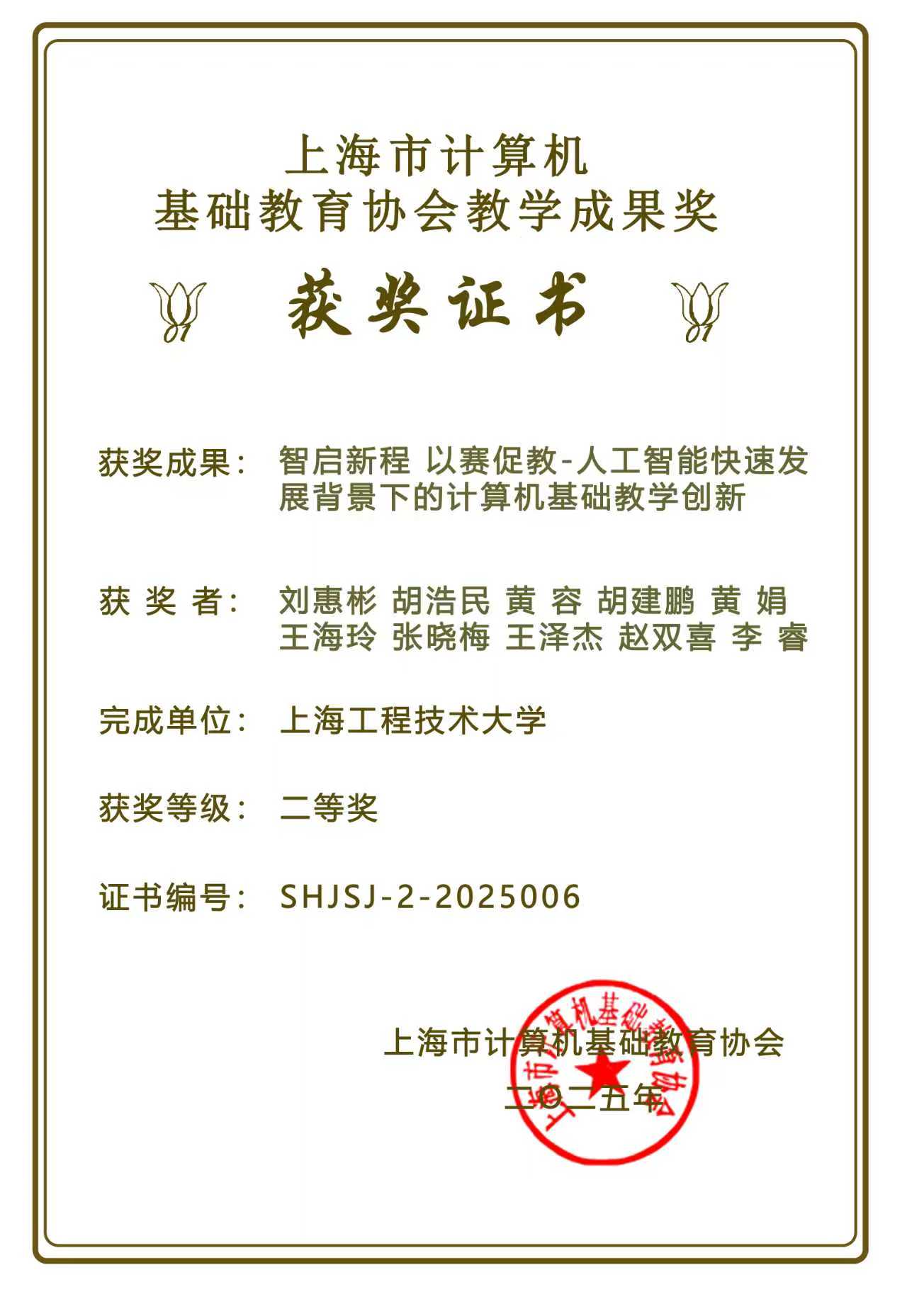 我院计算中心教师团队获得“上海市计算机基础教育协会优秀教学成果奖”二等奖。自2022年以来,计算中心教师团队在赵毅主任、陈强教授的带领下开展新一轮计算机通识课程教学改革,逐步在第一门计算机通识课程中加大人工智能知识模块比重,2025年9月,我校第一门计算机类通识课程更名为“人工智能基础与应用”,学院和教务处高度重视、大力支持,计算中心全体教师群策群力、深耕课堂,在充分调研的基础上,设计了适合我校非电类、文理科各专业的人工智能通识课程体系,受到上海市计算机基础教育协会和各兄弟院校同行的广泛认可。