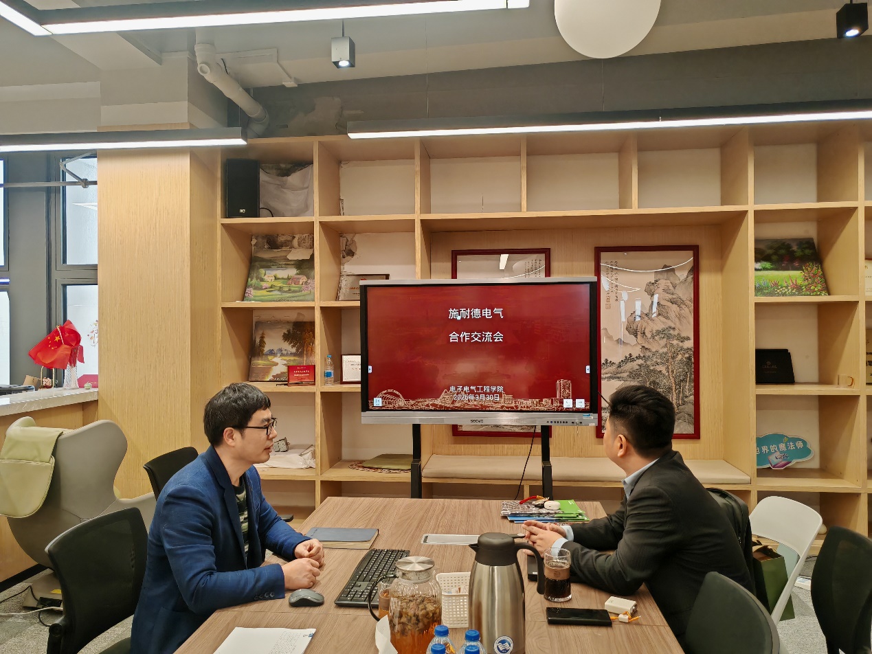 3月30日下午,学院与施耐德电气(中国)有限公司交流合作会在71001会议室举行。学院党委书记王成涛、施耐德校企合作首席专家陈斌等出席会议。