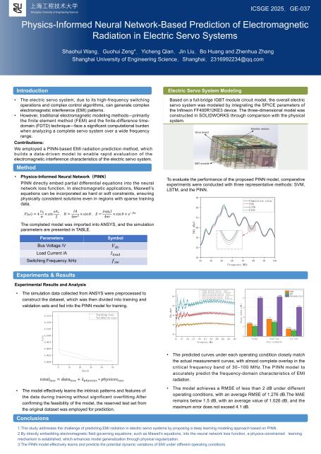 2025年12月12日至14日,2025 年智能电网与能源国际会议(ICSGE 2025)在广东广州顺利举办,上海工程技术大学电子电气工程学院研究生王少辉作为第一作者,携论文《Physics-Informed Neural Network-Based Prediction of Electromagnetic Radiation in Electric Servo Systems》参会交流,展示学院在电磁兼容与智能电力电子领域的最新科研成果。