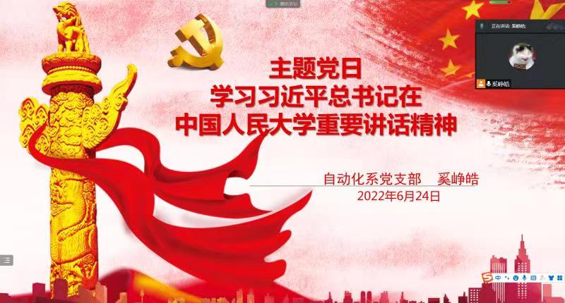 2022年6月24日,自动化系党支部通过腾讯会议线上平台召开了以“学习习近平总书记在中国人民大学重要讲话精神”为主题的党日活动。会议上,自动化系党支部书记奚峥皓老师首先介绍了学习背景,然后带领大家一起学习了相关的视频内容,传达了习近平总书记的重要讲话精神,重点解读了“扎根中国大地办大学:让党放心,不负人民”、“大课程:思政课的本质是讲道理”、“大命题:回答时代之题,彰显中国之理”、“大先生:‘经师’和‘人师’相统一”、“大熔炉:勇当开路先锋,争当事业闯将”等核心内容,并组织支部党员对如何贯彻落实讲话精神进行了探讨。