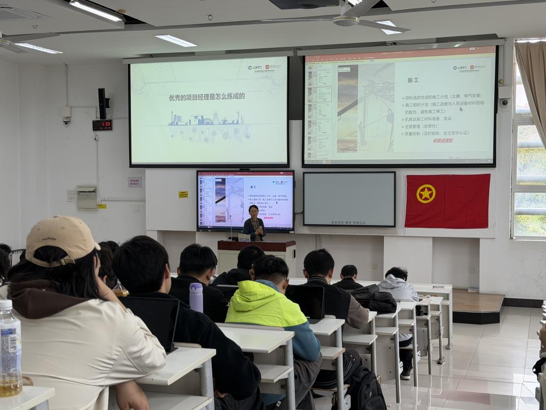 金经理系统梳理了上海电气集团海外总包项目的实施流程,首先从发电厂和变配电工程项目的准备、设计、采购、施工、交付等各个环节详细进行了介绍,随后讲解了项目实施的基本流程:包括项目启动、项目计划、项目实施、项目监控、项目收尾;紧接着重点介绍了优秀的项目经理需要具备哪些素质:包括适应能力(灵活调整策略)、创造力(创新的解决方案,突破传统)、处理不确定性的能力(勇于挑战、拍板、承担责任)等能力;最后以电气集团在海外承接的实际工程为案例,给同学们生动形象地介绍了实际工程中遇到的困难和问题及解决方案。金经理以一句真诚热切的话语:“每一个工程都不相同,每一次交付都是一次答卷,做为一个项目经理,最自豪的事情是向大家介绍:这是我做的工程。”结束了本次课程的讲解。