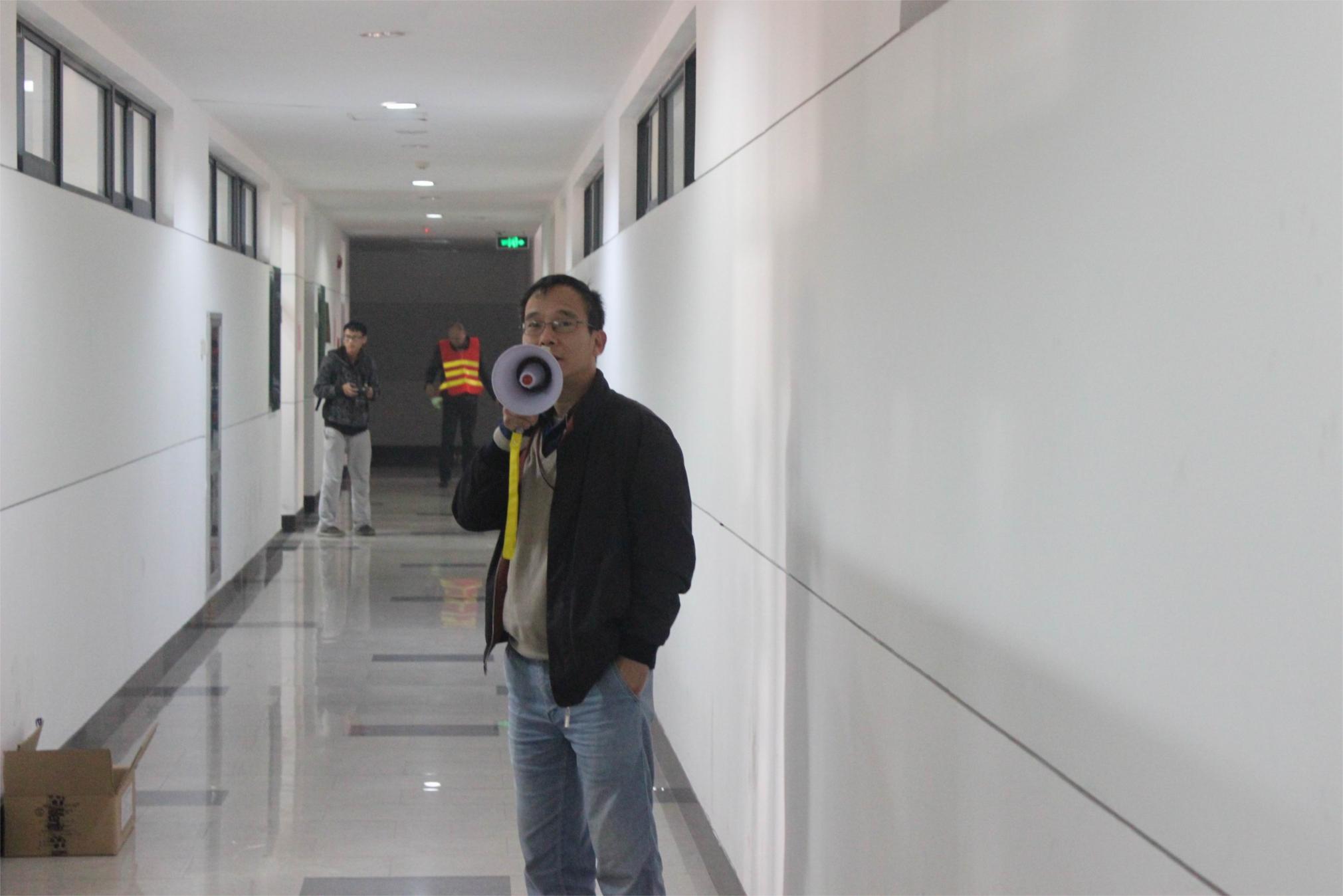 疏散逃生演练活动现在开始!”随着站在工程实训中心1号楼2层的电子电气工程学院消防演练小组副组长、院长助理高飞老师一声令下,凄厉刺耳的警铃随即在楼道里响起,所有拿湿毛巾捂嘴的学生迅速从2个实验室里奔出,在穿荧光背心手持荧光棒的老师的指引下,弯腰沿着逃生路线急速向集合地点集合。