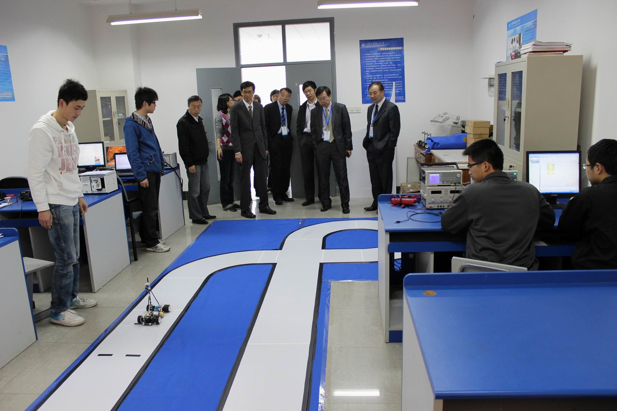 认证专家们一行认真参观了proteus创新实验室、汽车电器及仪表实验室,汽车发动机控制综合实验室、数字电视互动点播系统综合实验室等实验室,他们和实验室负责老师交流咨询,和正在上课的学生亲切交谈,认真了解实验室设备的教学情况和使用情况。专家们在实验室饶有兴趣地观看了学生们制作的参加飞思卡尔竞赛的小赛车在跑道上运行的情况,并询问了一些有关的专业问题。在学生作品展示区,专家们浏览了中外合作专业学生近年来所取得的成绩,仔细查看了他们的作品。