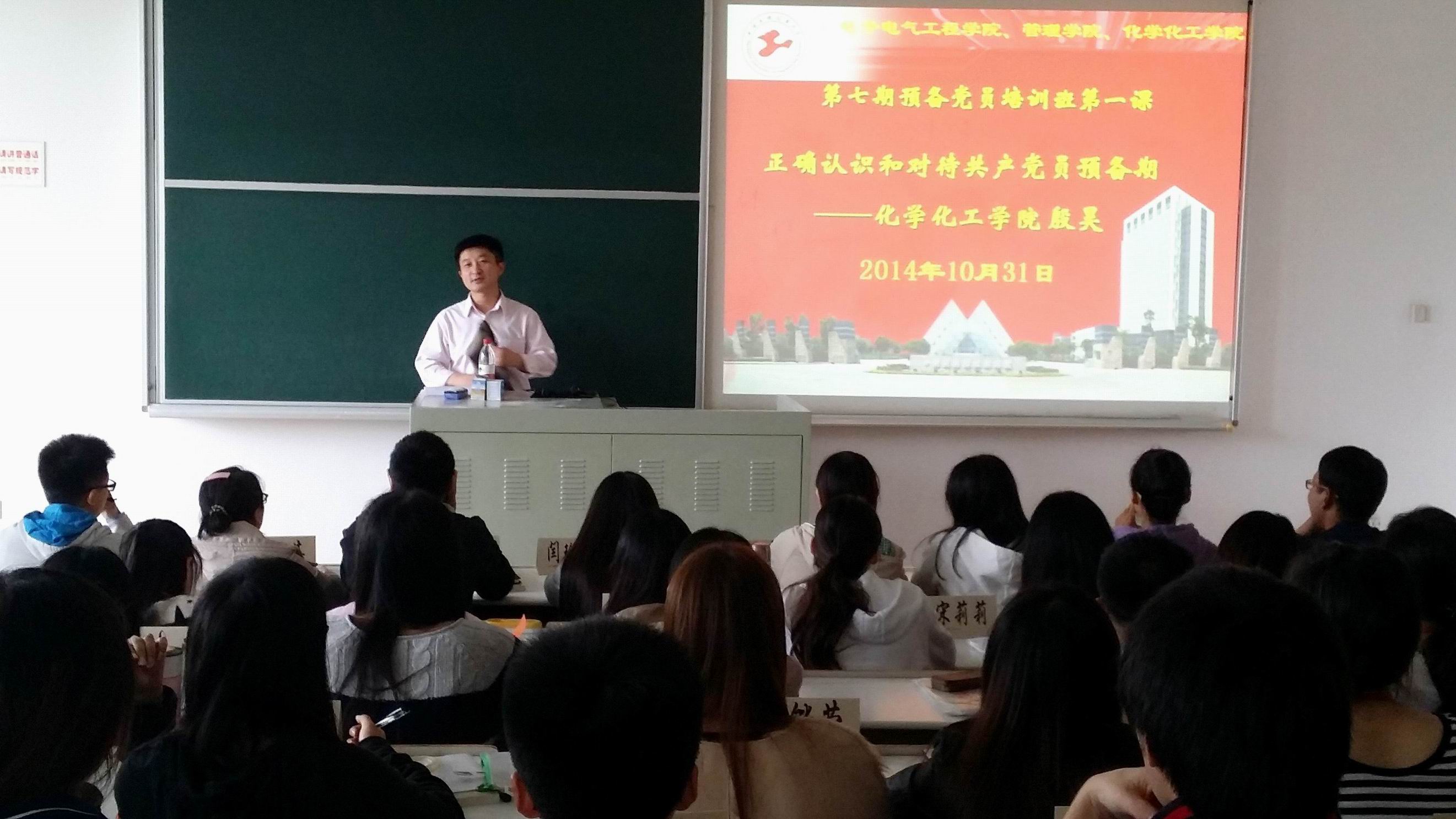 10月31日下午,上海工程技术大学第七期预备党员培训班第一课在教学楼F210开讲,化学化工学院殷昊老师作了“正确认识和对待共产党员预备期”的专题讲座,来自电子电气工程学院、化学化工学院和管理学院三个学院的全体预备党员聆听了讲座。