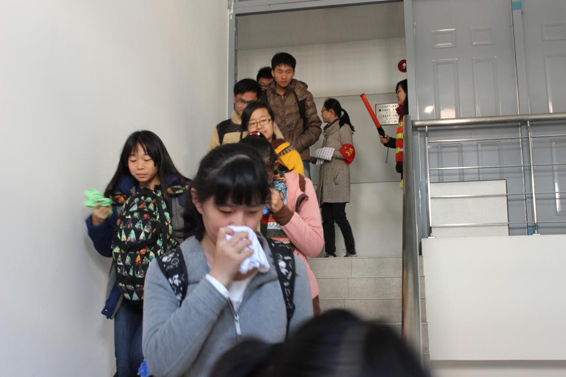 随着9:45分下课铃声一响,副组长立即下达了逃生演练开始的命令,参加演练的师生根据逃生方案,用毛巾捂住口鼻,弯腰俯身行走并在引导员的正确指挥下,迅速、有序地从通道两侧的消防通道疏散至室外指定集合地点。集结后通讯组成员立即对疏散学生进行清点,所有参演师生均顺利完成“逃生”,演练活动取得圆满成功。