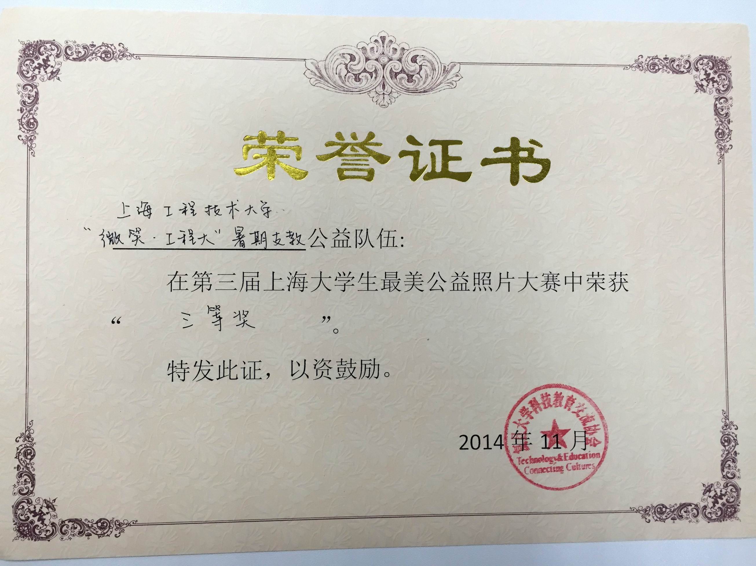 电子电气工程学院历来十分重视对学生社会责任意识的培养和实践能力的锻炼,今年学院暑期社会实践团队赴甘肃肃南裕固族自治县参与支教项目,杨诗琼同学作为团队一员,在支教过程中拍摄的照片参加了由复旦大学科技教育交流协会主办,复旦团委、华桥基金会等单位协办的“上海大学生最美公益照片大赛”。经过预赛、初赛、复赛和决赛,我校从本市各高校的公益队伍中脱颖而出,荣获三等奖。