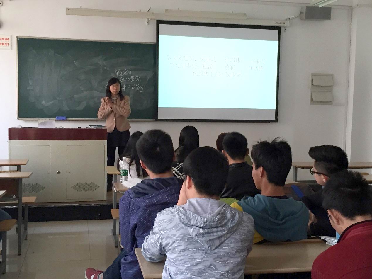 主题班会由侯俊梁同学主持。班会一开始,班主任单鸿涛老师就再次对学分问题做出强调,提醒同学们一定要认真学习,不能有学分拖欠。之后,侯俊梁同学宣布了上学期的学习先进奖、学习进步奖和优秀班干部,获奖者分别是:崔玮玮,汪振宇,莫承龙,杜游,蔡润,江碧雅和侯俊梁同学,班级给予了充分表扬及奖励!特别是杜游、蔡润和江碧雅同学,他们虽然是插班生,但上学期认真努力地学习,最终获得了不错的成绩,为其他同学树立了榜样。