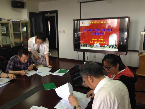 5月13日下午,在行政楼9楼,电子电气工程学院开展了围绕“2015年教学质量月”大学生毕业设计中期检查会。中期检查专家组主要由各教学团队负责人组成,随机抽查全院14个班级共计28名学生。