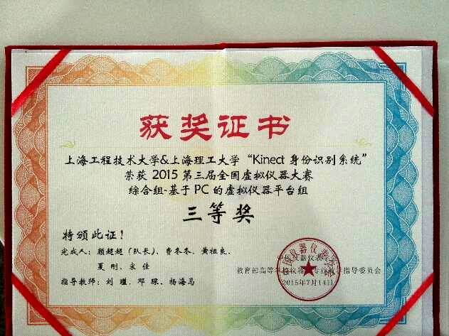 7月14日,在哈尔滨工业大学举行的第三届全国虚拟仪器大赛决赛现场传来捷报,我校电子电气工程学院颜超超(队长)、黄祖良、费冬冬等同学在邓琛、刘瑾老师指导下设计的作品“kinect人体身份识别系统”,历经初审、复审环节的激烈角逐杀入决赛,最终荣获全国三等奖。该作品主要以Labview软件为开发平台,利用kinect体感传感器,实现人体身份的远距离、非接触式的检测,具有较好的创新性与实用性。