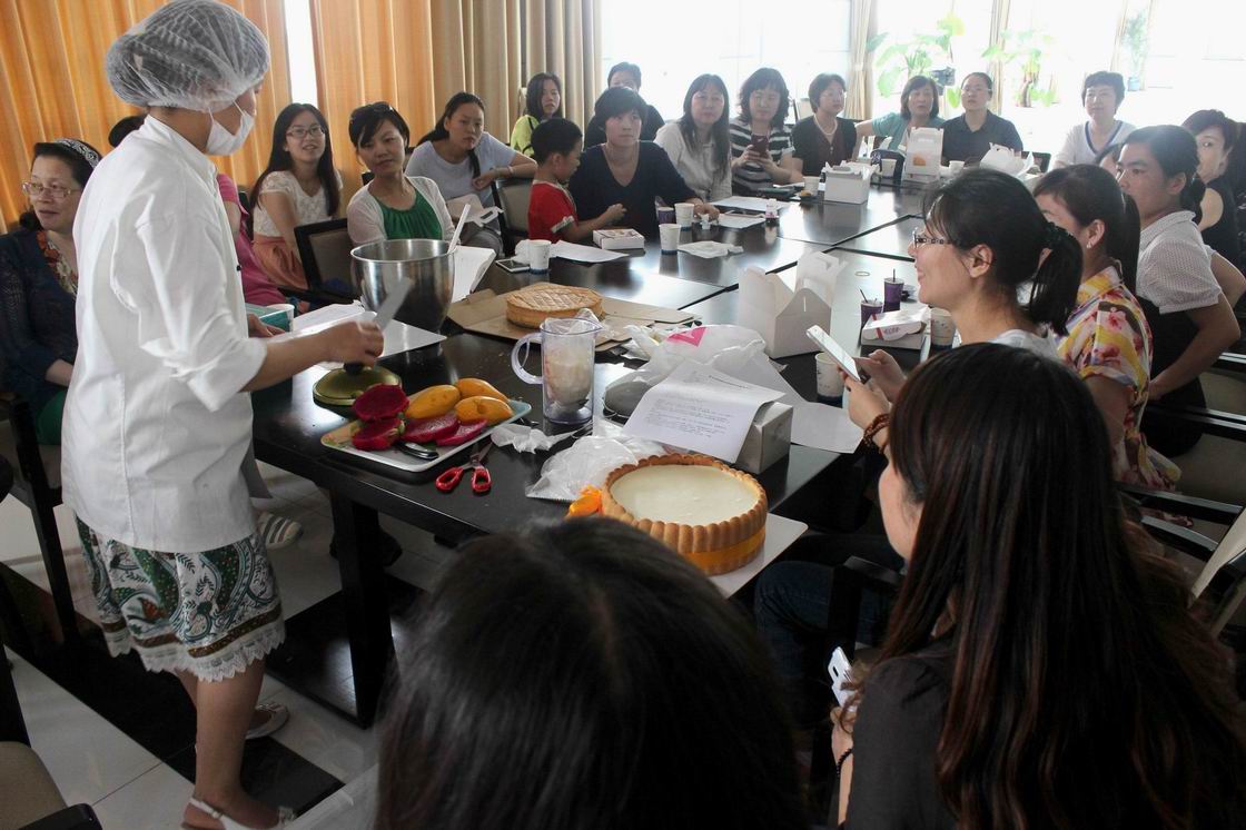 活动邀请松江专业点心师舒师傅为大家展示了做甜点的技术,她一边讲解一边操作,让大家近距离真切地领略到自制甜品的魅力。在座的女教师们聚精会神地听讲,目不转睛地仔细观看。大家请教了舒师傅很多问题,掌握了很多操作的技巧。