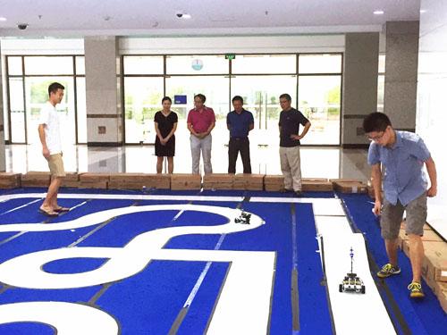 方院长详细询问了学生的学习状况和备战情况,希望学生多向指导老师请教交流,及时发现问题,完善数据设计和车辆调试,充分准备决赛。方院长还向指导教师沈行良老师了解了目前准备工作存在的一些困难和需要,鼓励大家以最佳的状态投入到比赛中。随后,方院长一行现场观看了参赛队伍的模拟赛道智能汽车试跑情况,并向参赛学生发放了慰问品,嘱咐他们劳逸结合,以饱满的精神状态迎接比赛。