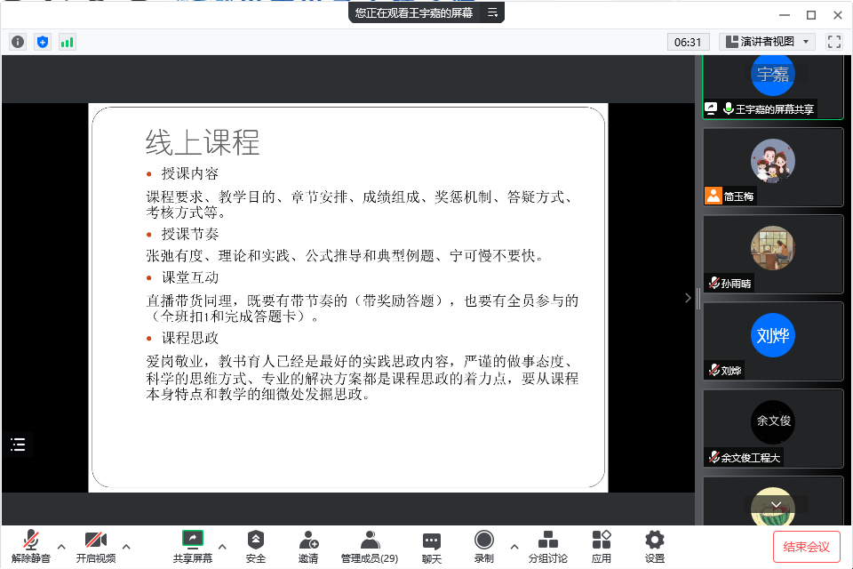随后,王宇嘉老师针对线上教学,从课前准备、教学方式、授课内容、课堂互动、课程思政、课后反思等多个方面分享了自己的做法。